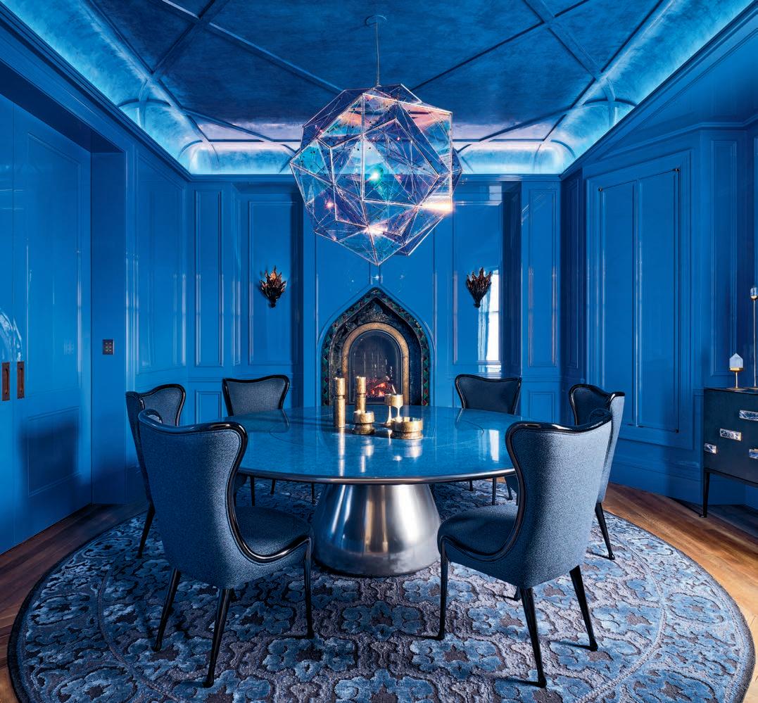 This page: This dining room will give you the blues—in a good way. The main lacquer table, from the interior designer’s own studio, is flanked by blue Mattia Bonetti chairs and sits atop a rug by Shiir. Lighting here also is dramatic, with sconces by Mattia Bonetti and Olafur Eliasson’s “No Symmetry in the Ocean” asymmetrical light fixture.