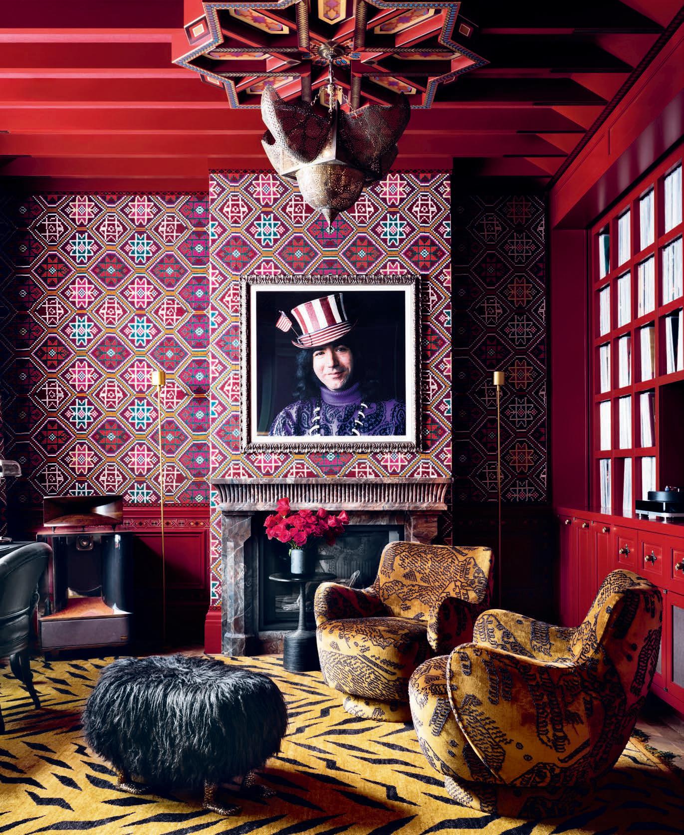 This page: Hollis traveled the world with the music-loving homeowners for inspiration. From the U.K., Beatles Portfolio: John Lennon, Ringo Starr, George Harrison and Paul McCartney by Richard Avedon hangs above a sitting-room fireplace. The Fab Four isn’t the room’s only artisan piece. The heart-chain chandelier is by Goossens Paris, the chairs are from Dimorestudio, the coffee table is by Sam Orlando Miller and the rug by Beauvais. A pair of parquetry armchairs are antiques from Syria circa 1900.