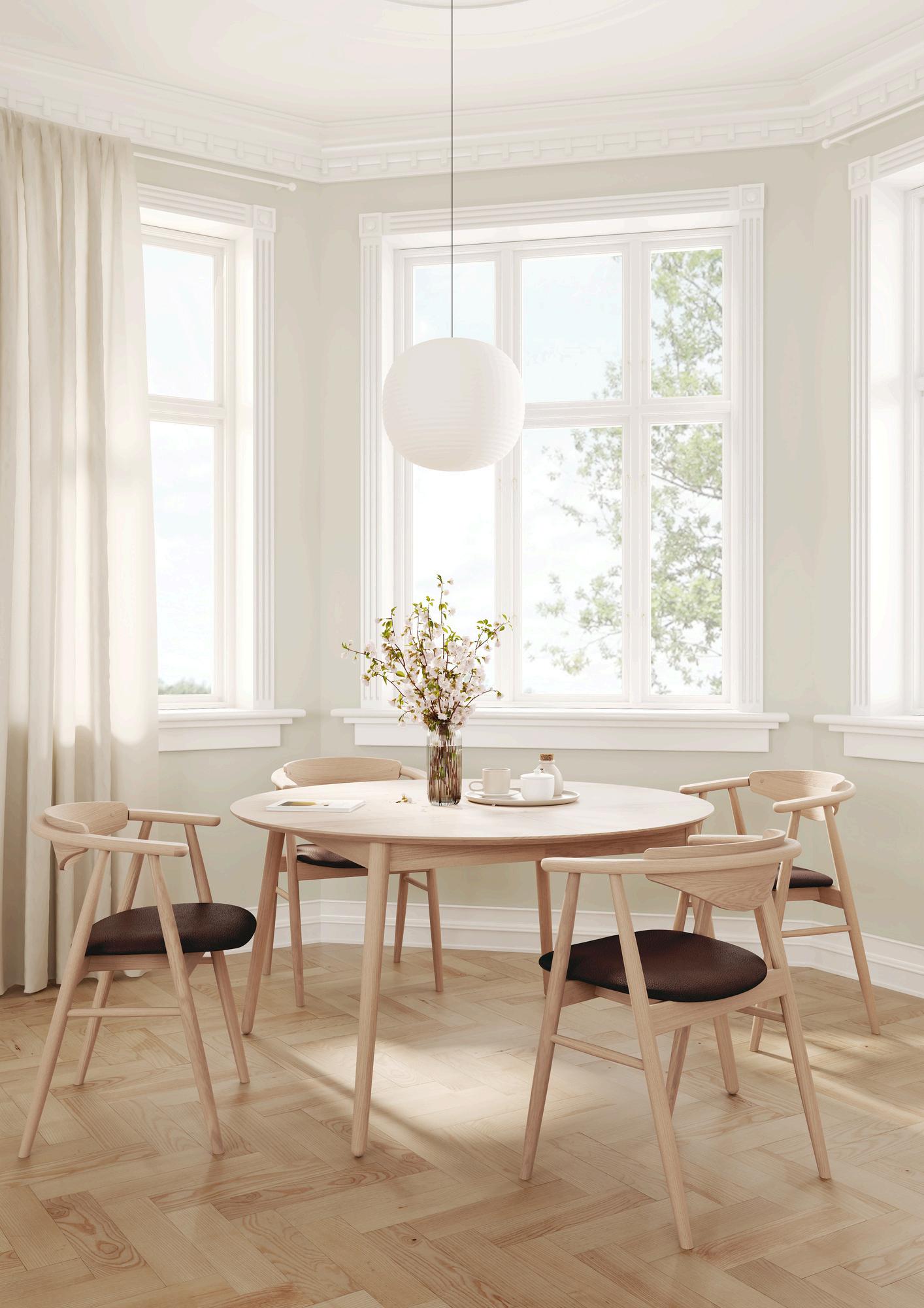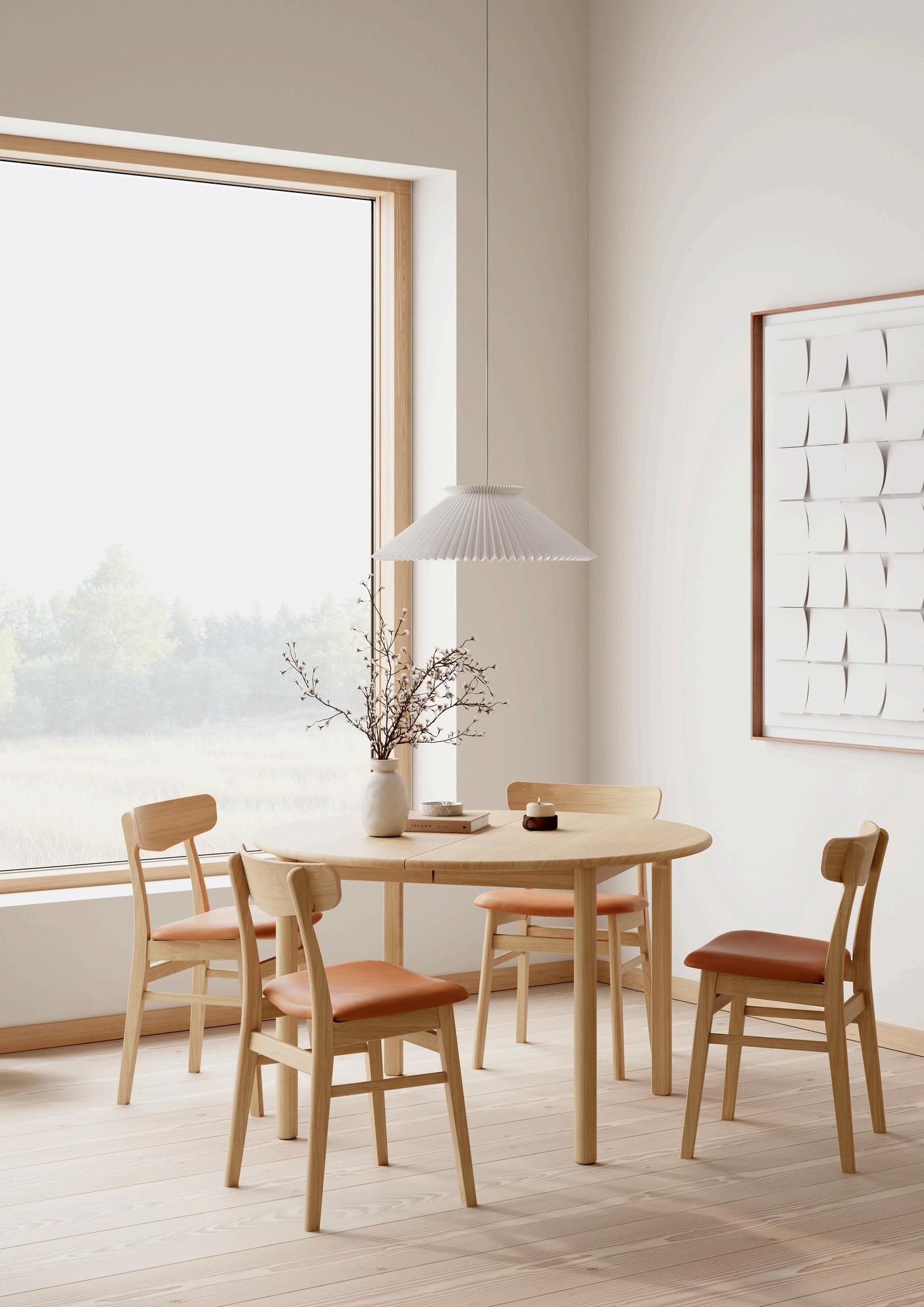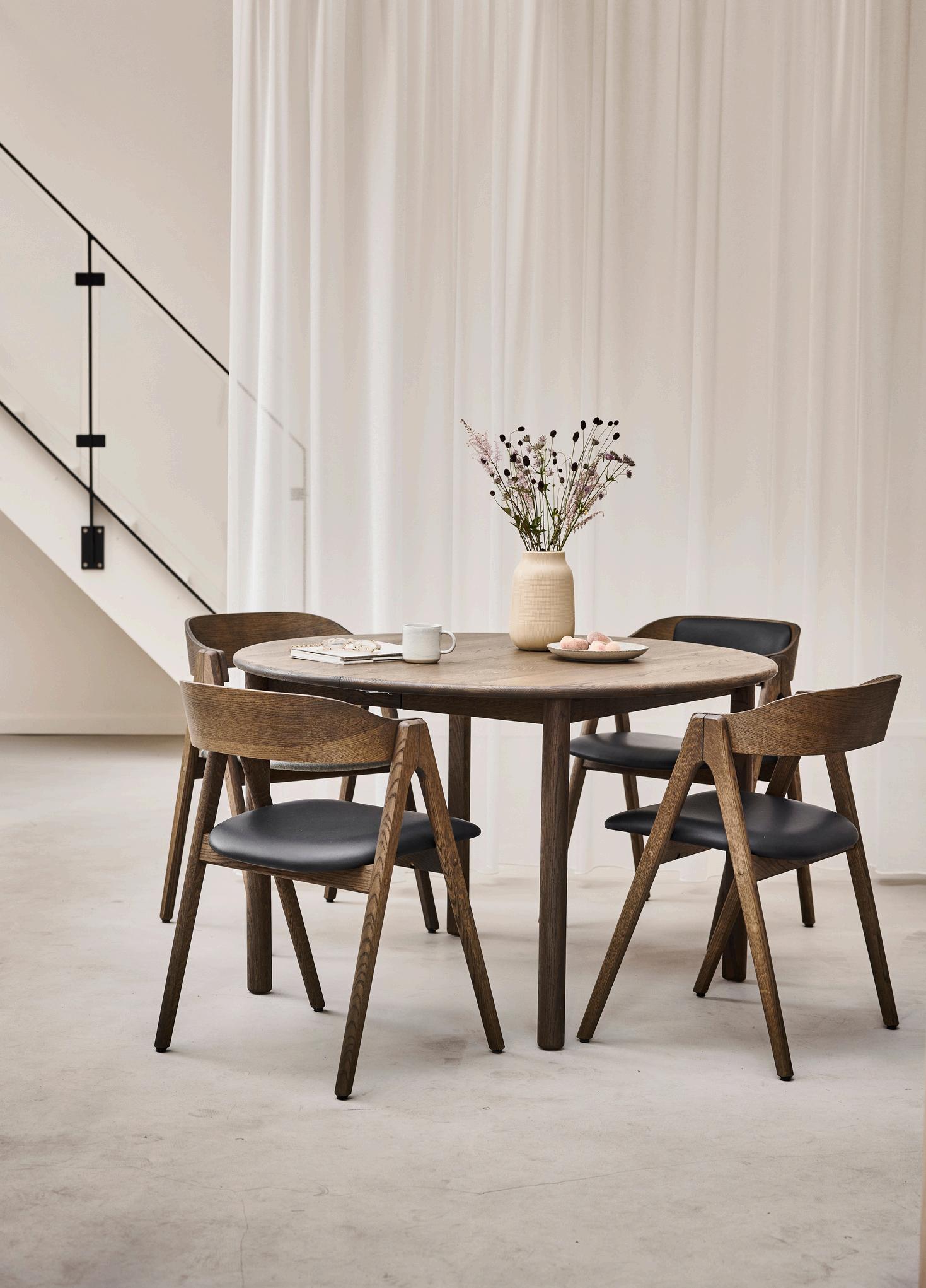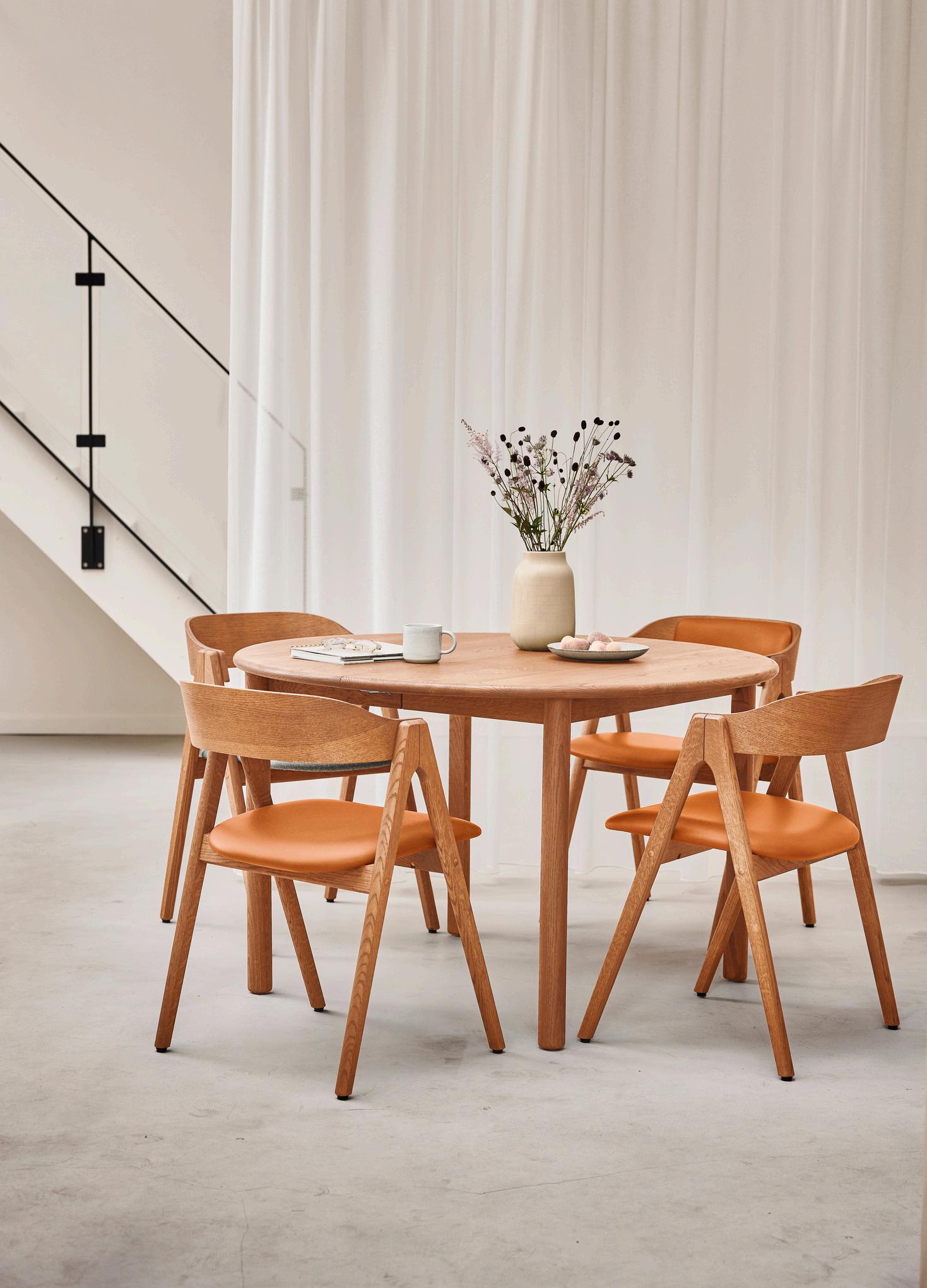 MEZA by Hammel rundt bord med udtræk, hvidpigmenteret eg, TRADITION by Hammel stole hvidpigmenteret eg, sydney choko læder