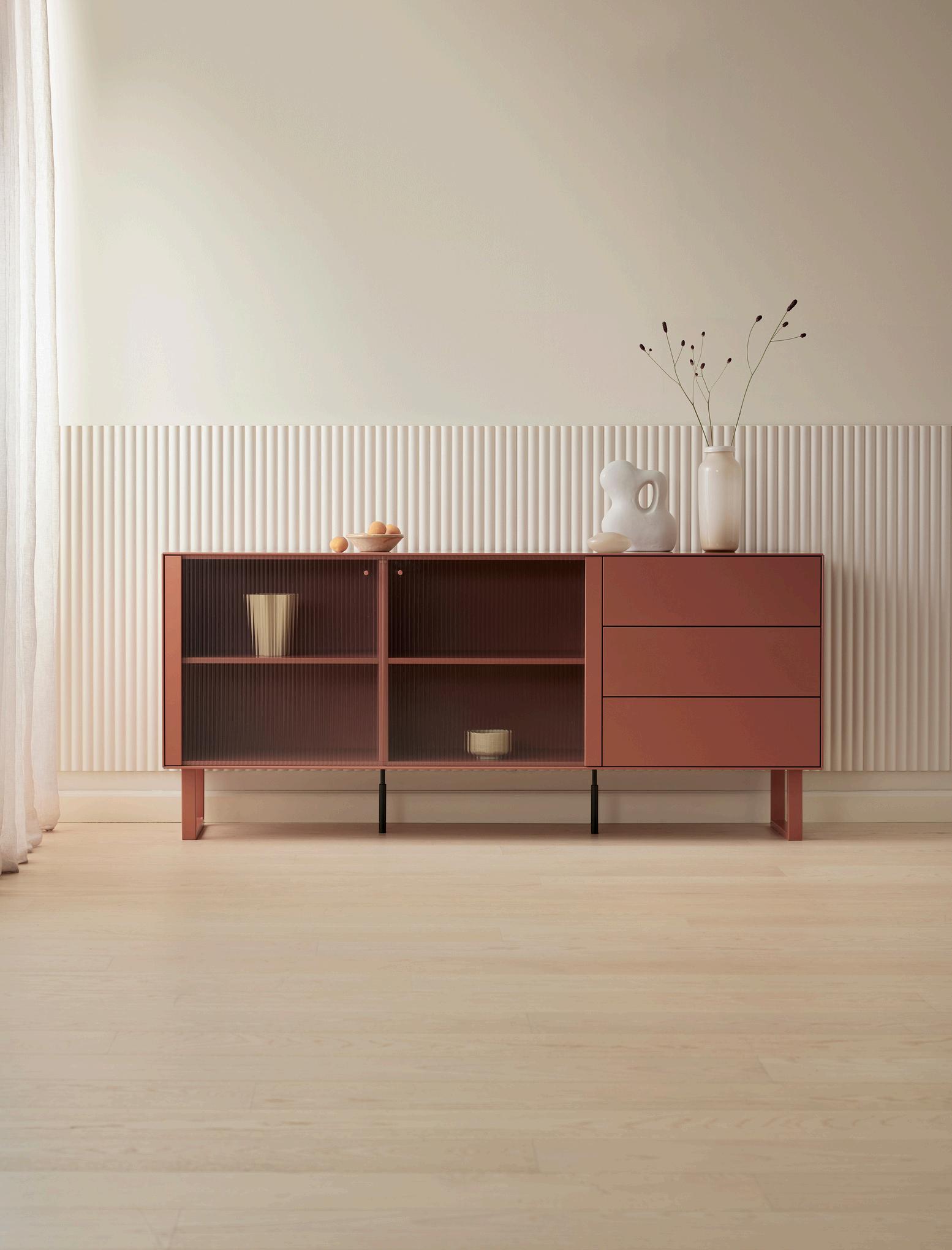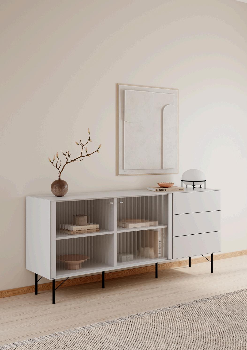 EDGE by Hammel skænk, modul 500 kombineret med 024 skuffer og 054, 055 rillede glasdøre, 198, 174 ben