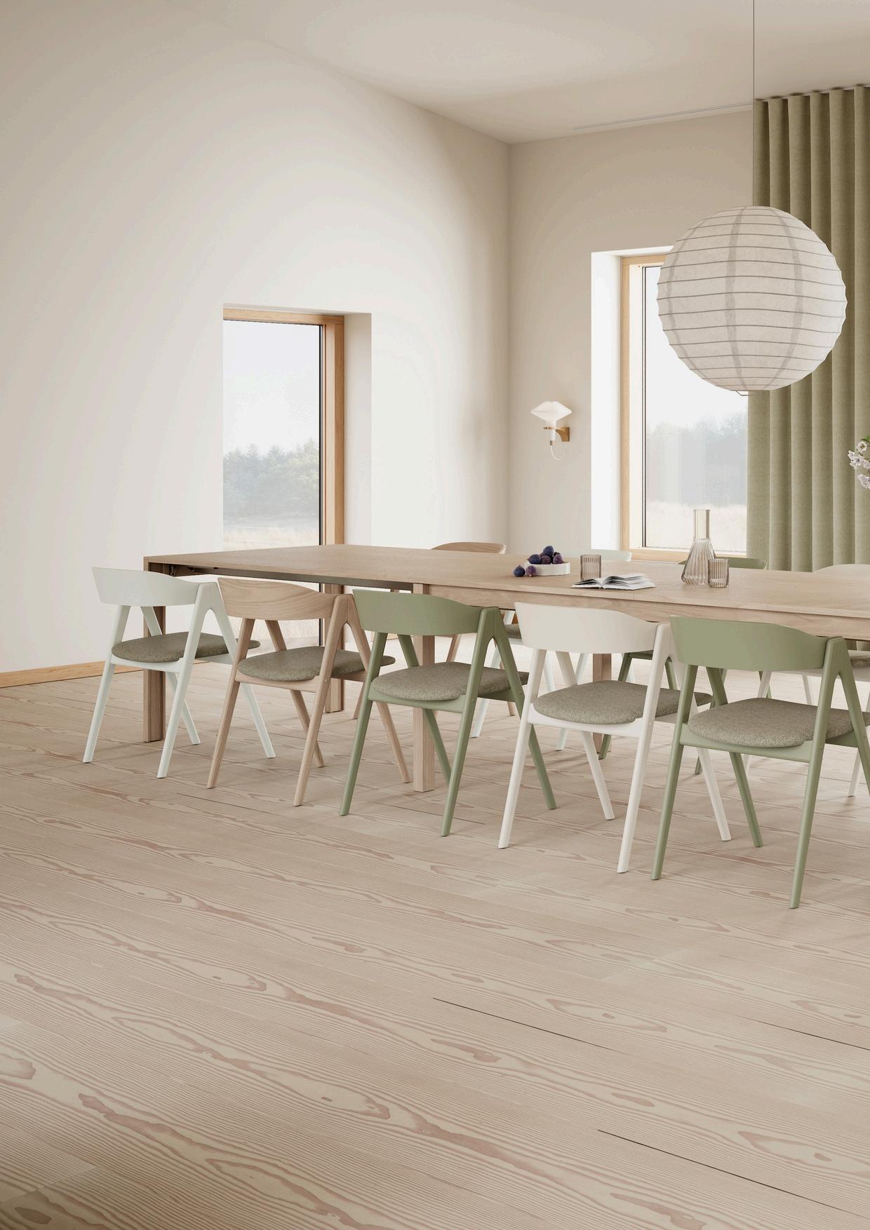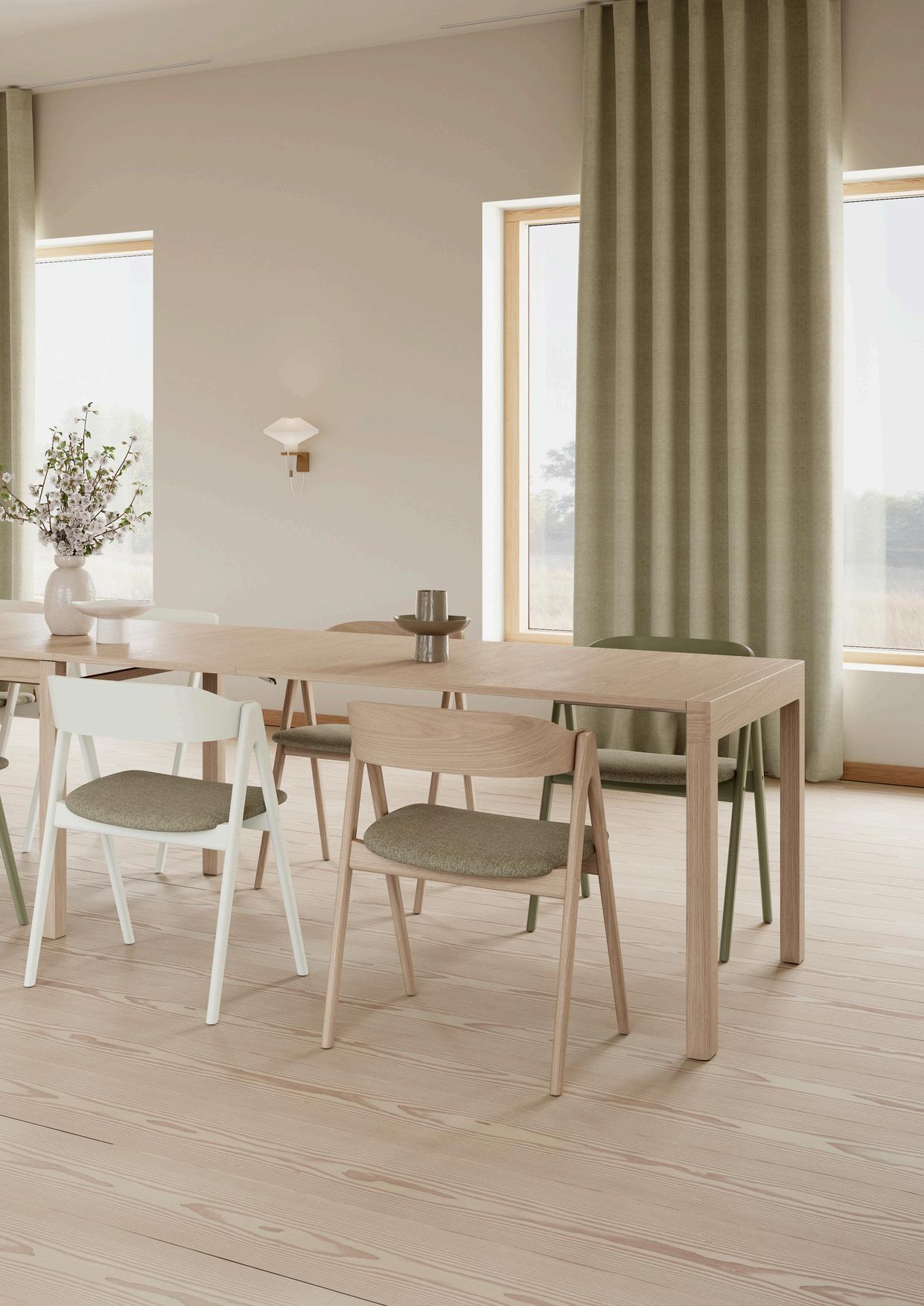 JOIN by Hammel bord, ben i massiv eg og top i finer, hvidpigmenteret eg METTE by Hammel stol i mint, olivengrøn, beige, hvidpigmenteret eg, sæde i step melange 61104