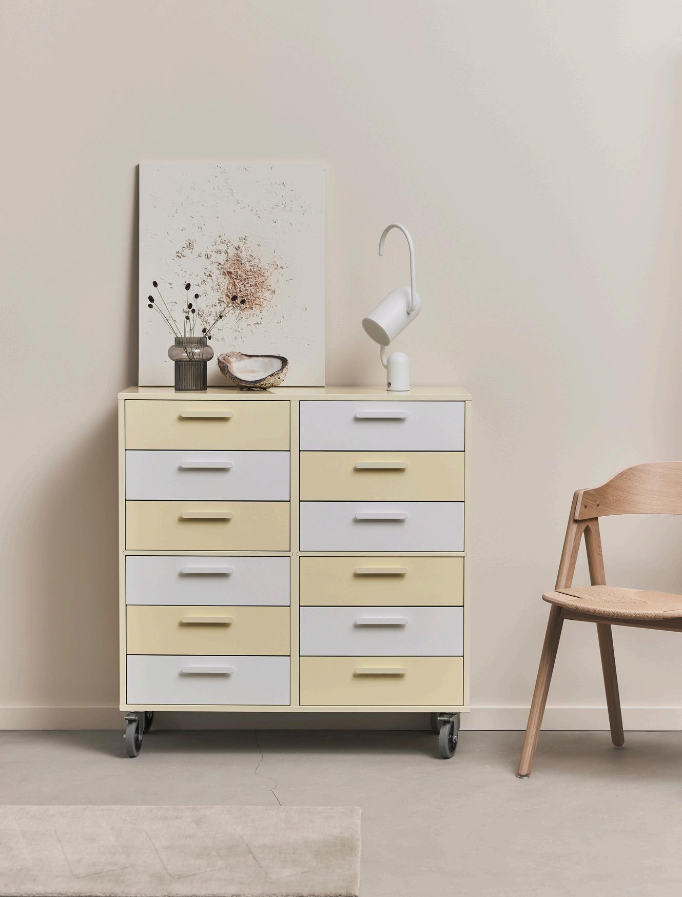 KEEP by Hammel kommode, bestående af modul 006 kombineret med 021 skuffer, 187 hjul, hvid, lysegul