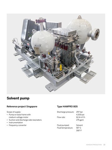 Scope of supply: • Pump on base frame with medium voltage motor • Suction and discharge side resonators • Instrumentation • Frequency converter