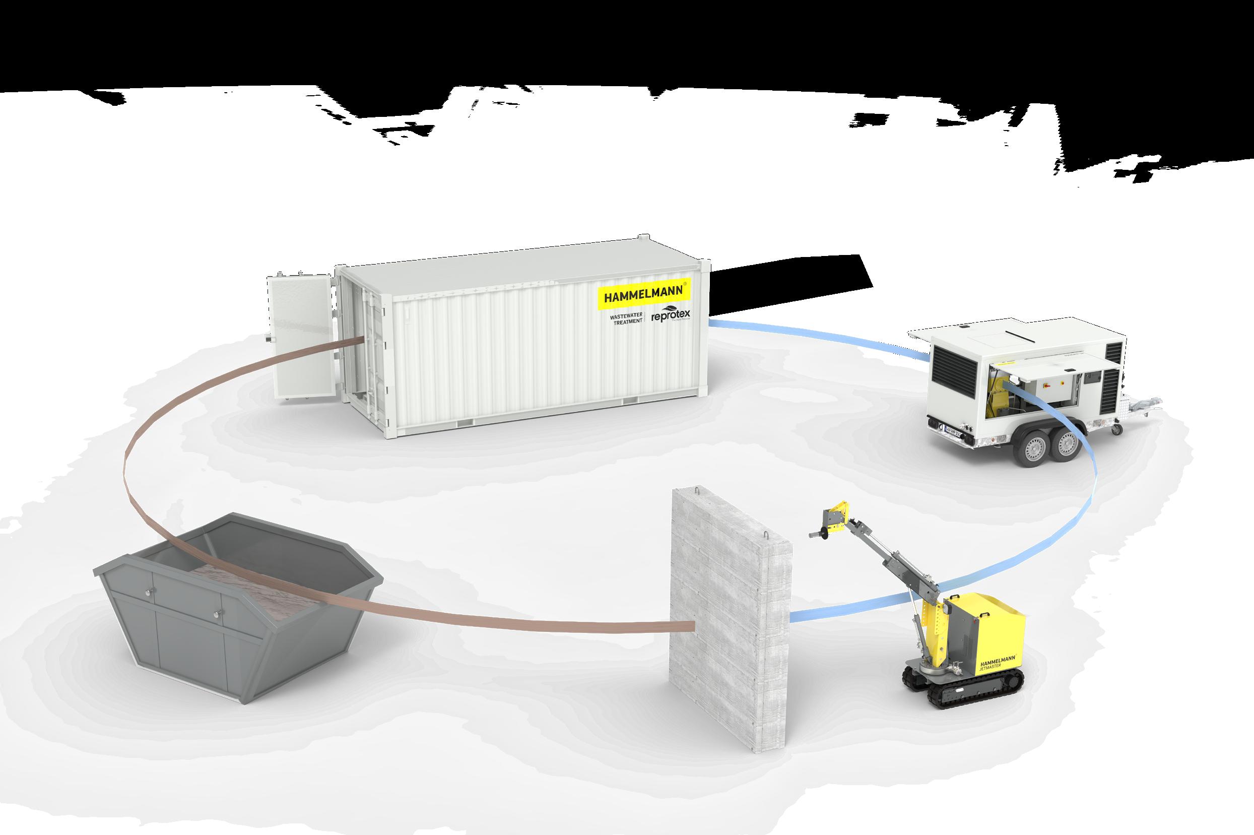 Nach der Aufbereitung kann es als Klarwasser wiederverwendet bzw. eingeleitet werden. Die mobile Wasseraufbereitungsanlage steht getrennt vom Hochdrucksystem als unabhängiges Verbindungselement zwischen dem gesammelten Abwasser und dem aufbereiteten Klarwasser.