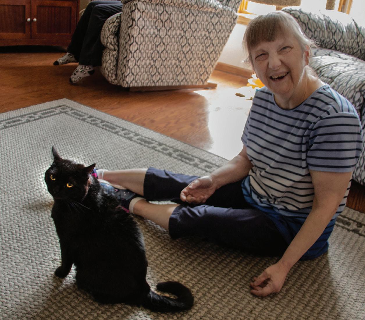 Mary Anne, one of four women supported at NER's Hale home in Oakdale, MN. Pictured with her is Gracie, one of two cats who also live at the Hale home. L to R: Alex and Doug supported at Hammer's Carlson home with Mary Gaasch, Director of Advocacy and Community Relations at Hammer Residences and Northeast Residence.