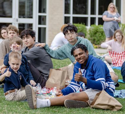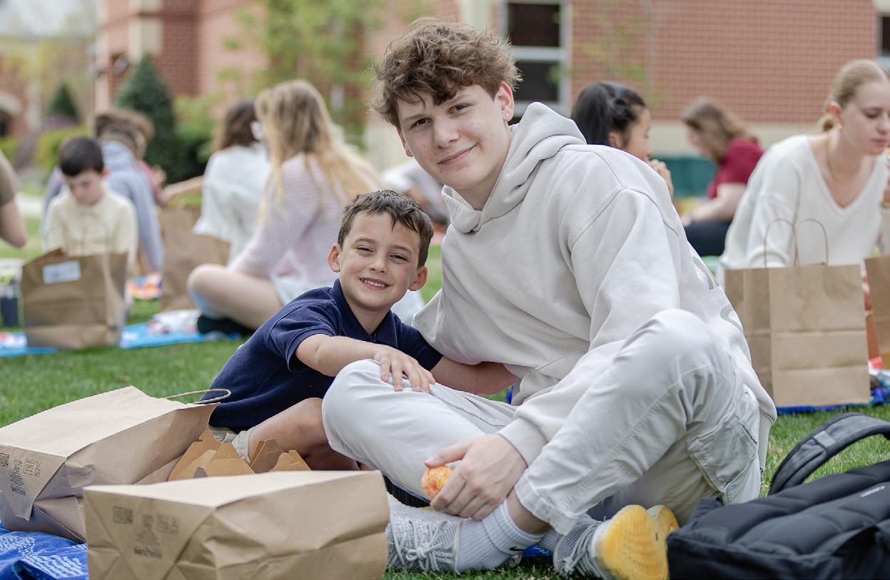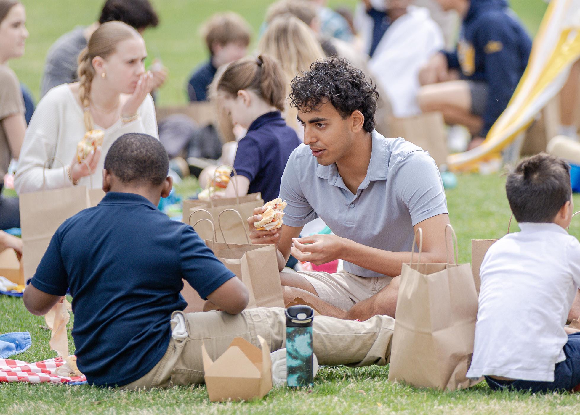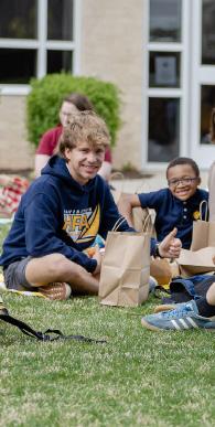 Senior class valedictorian Ishan Hartke shares lunch with young Navigators at the First Grade-Senior Buddies spring picnic