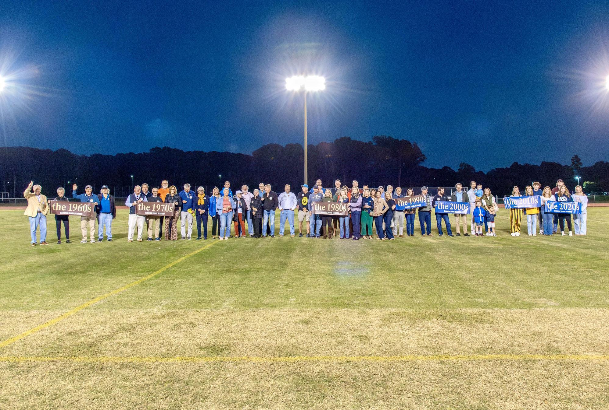 HRA alumni line up on the field by decade during the 2024 Homecoming varsity soccer game