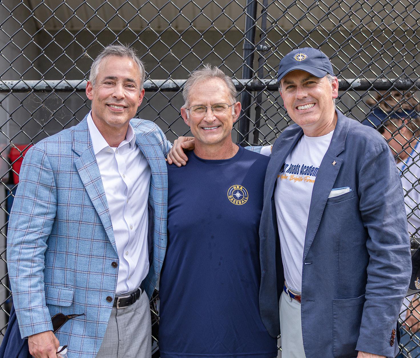 Yevak celebrates with outgoing trustee Mark Short ’83 and Head of School Jay Lasley at the baseball field dedication on HRA Day 2025