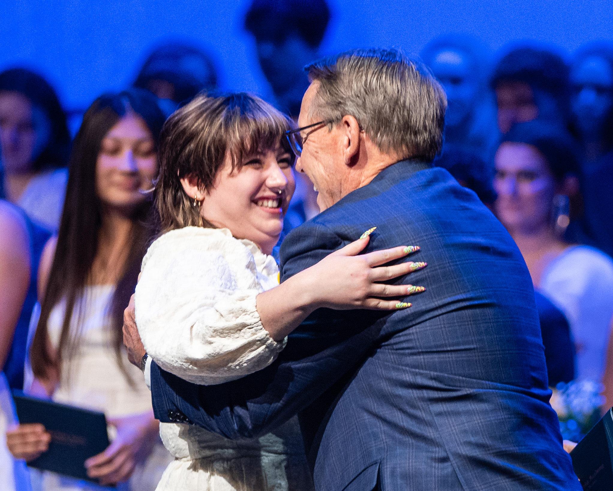 Graduation is an emotional occasion for every senior at Hampton Roads Academy, but this past May’s Commencement Ceremony was particularly special for Elly Flannery ’25. After her name had been read and she had received her diploma, she flew straight into the arms of her grandfather, outgoing trustee and longtime supporter of HRA Larry Pope.