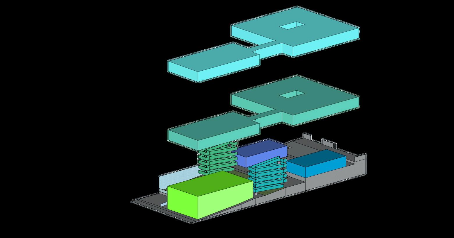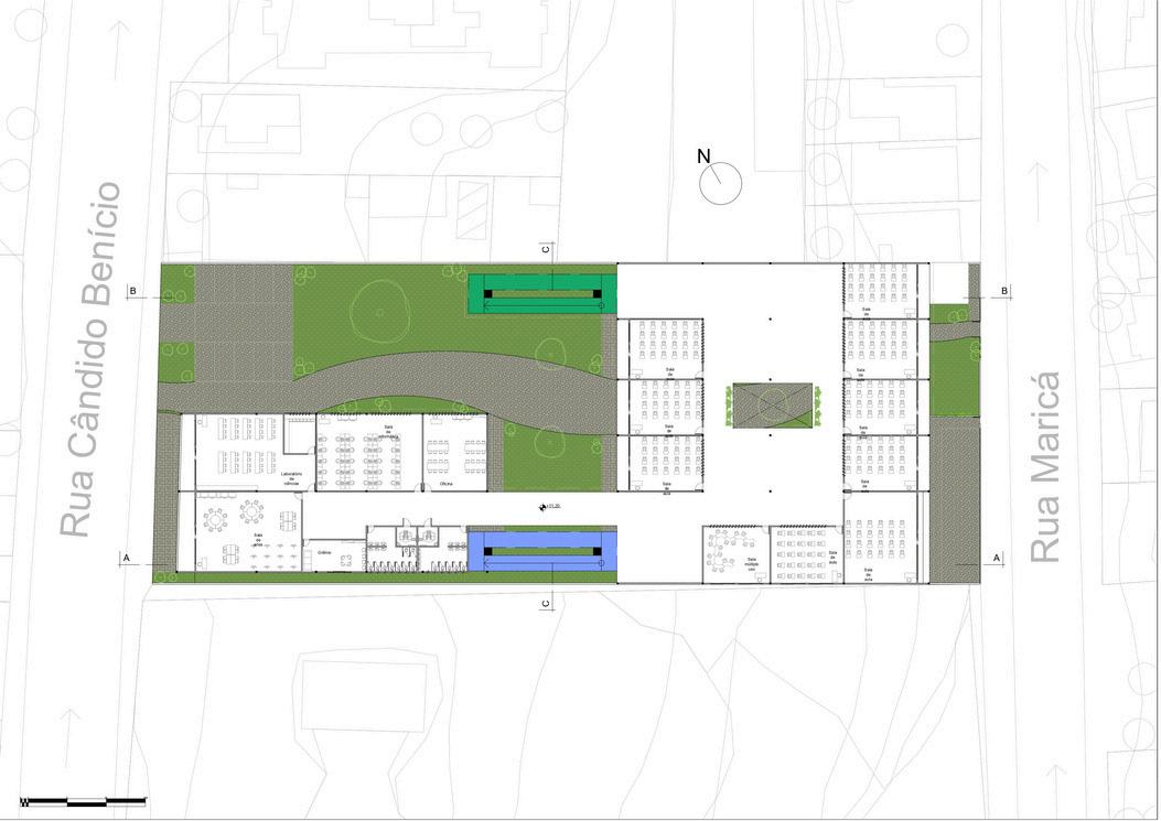 O terreno em topografia foi adaptado para ser uma rampa natural em que as edificações separadas em 3 blocos ficariam em platores.