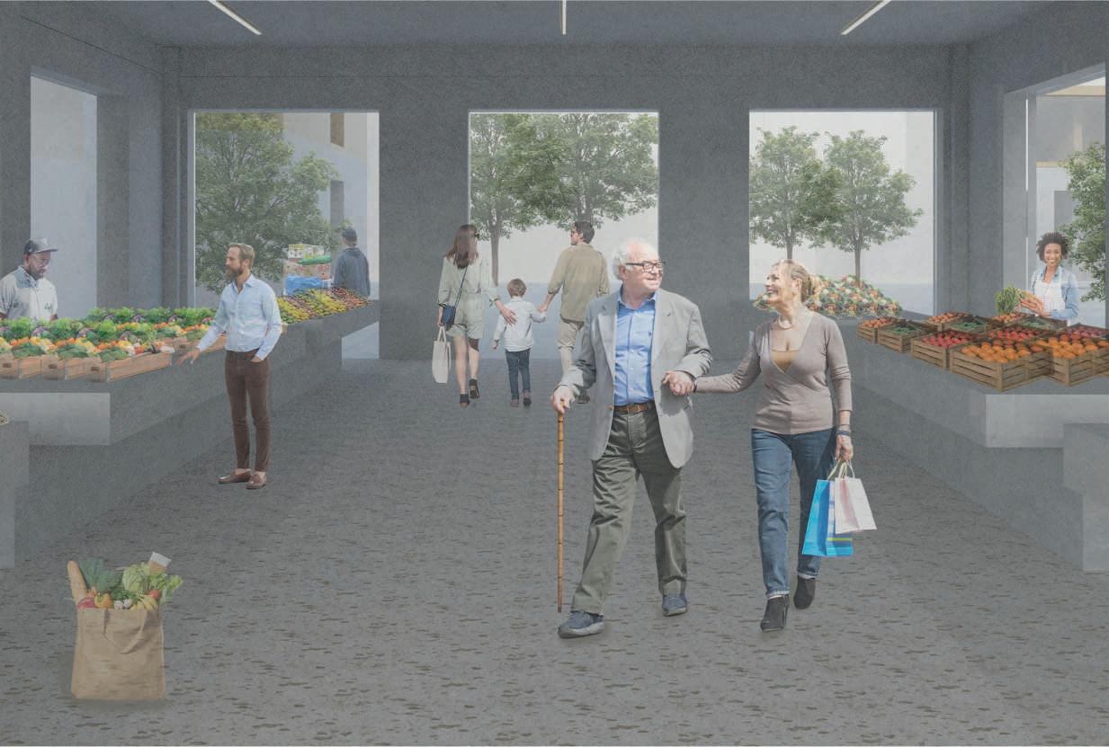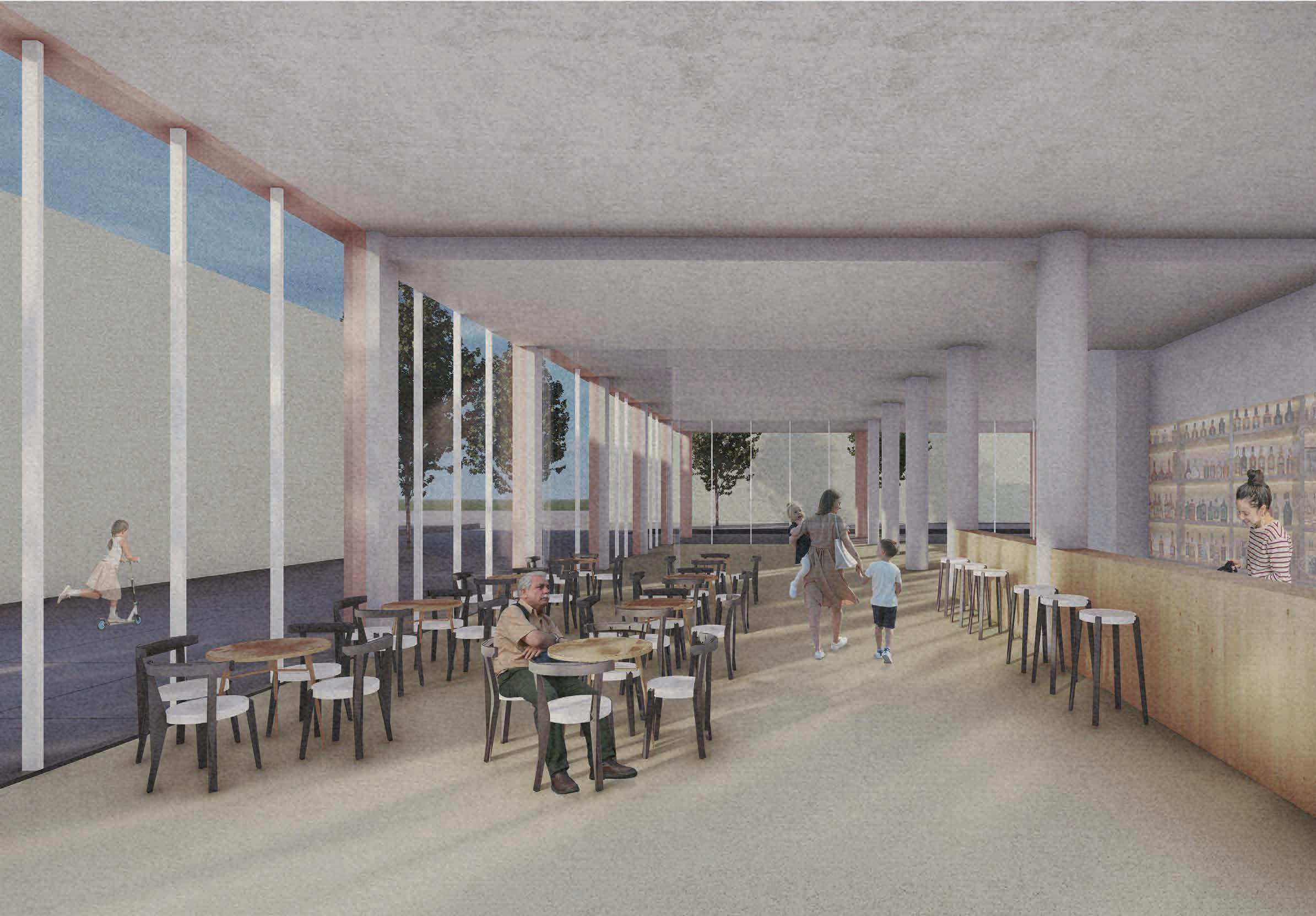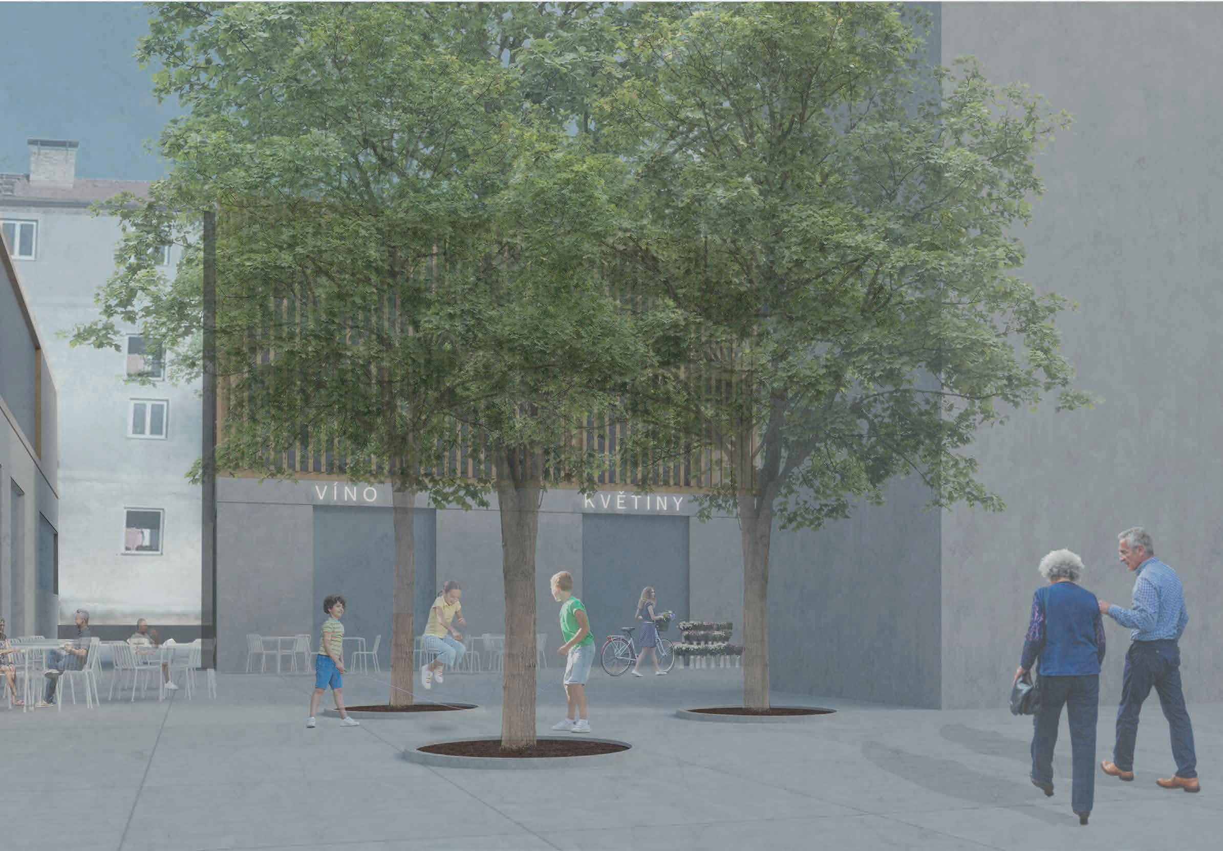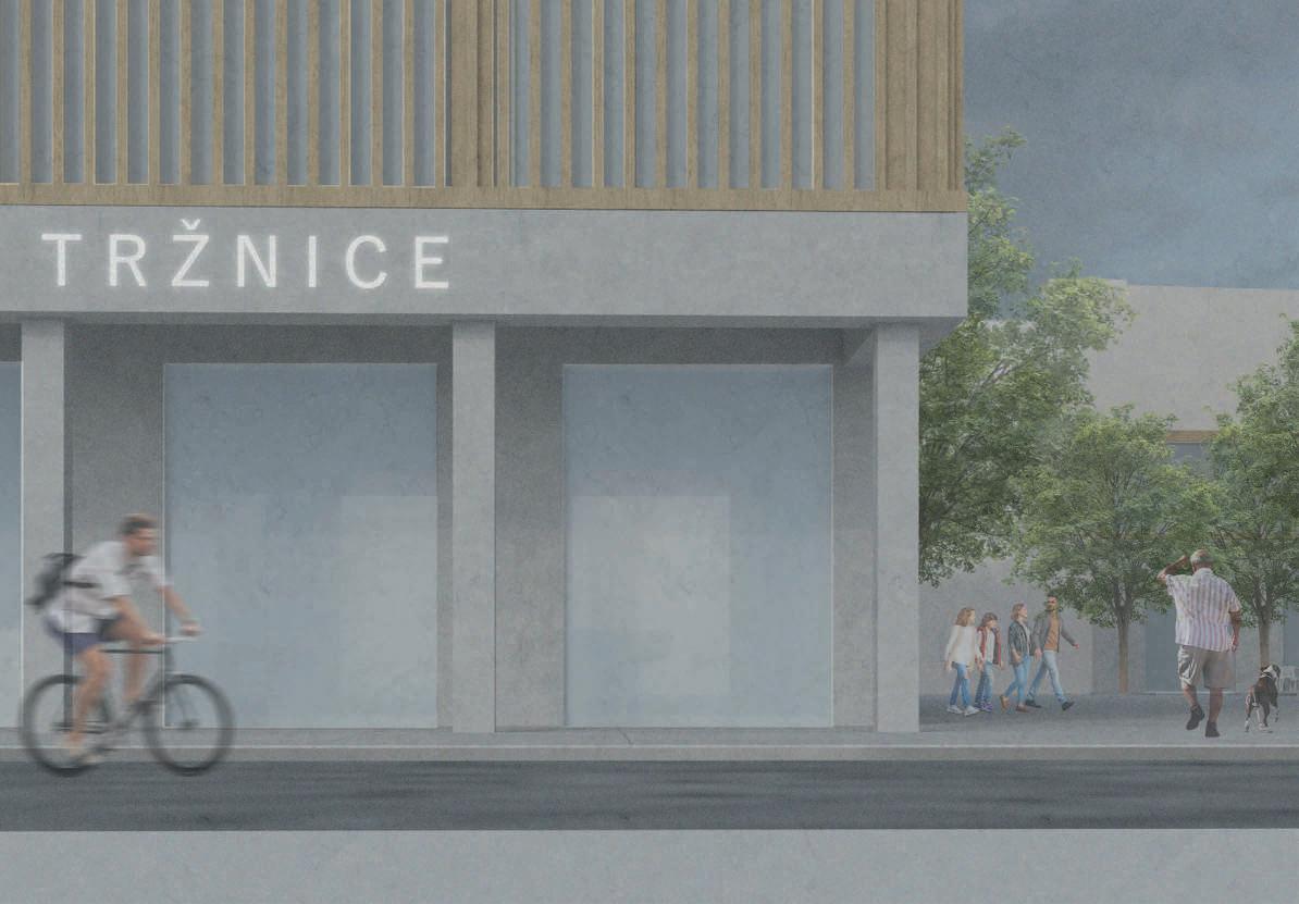 There is a market and shops on the ground floor. The market can also expand out between the houses and into the square. The greenery builds on the existing one and extends further, forming a quieter area with a café and a restaurant.