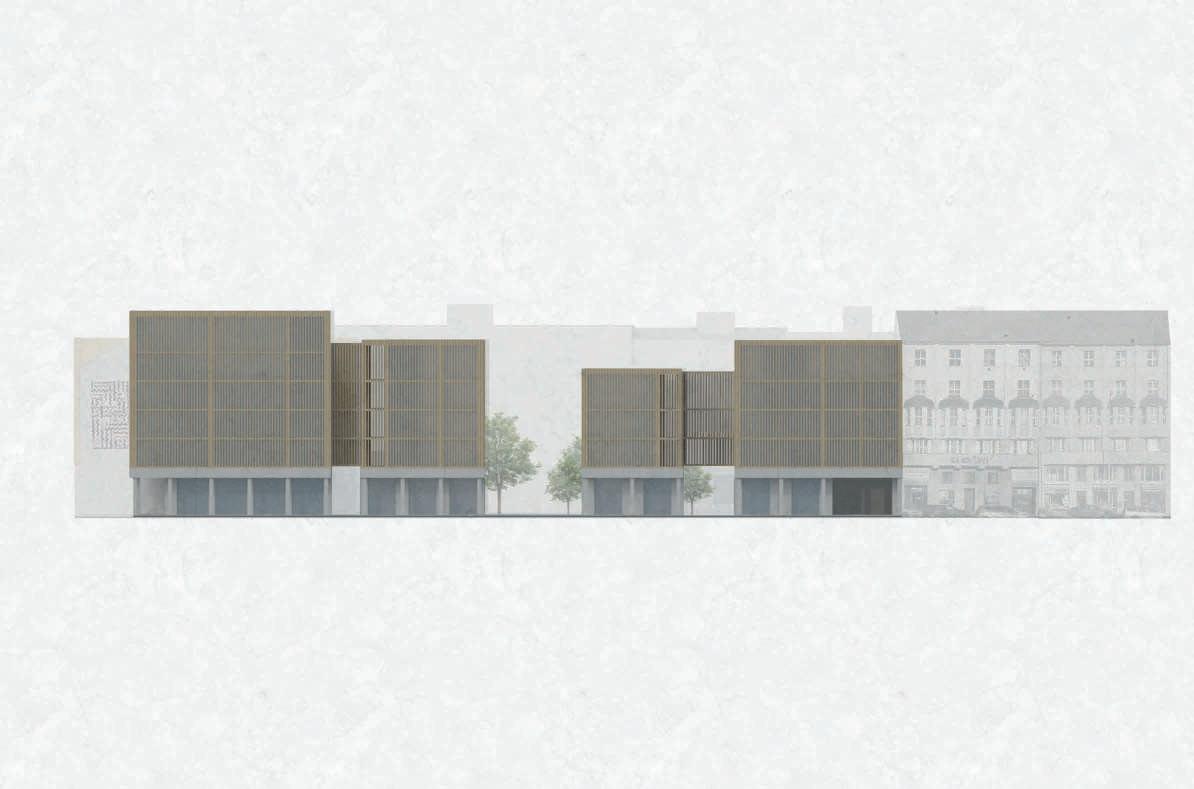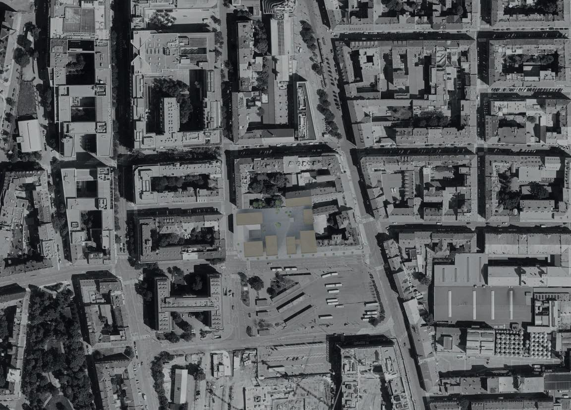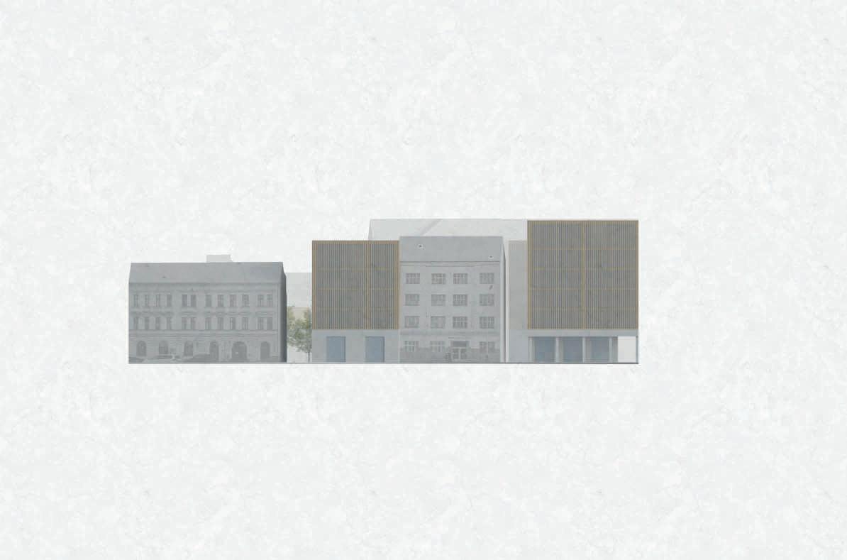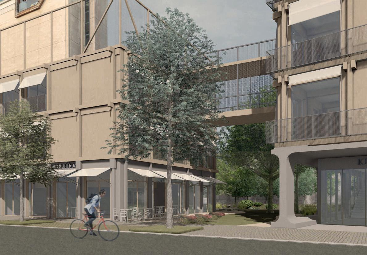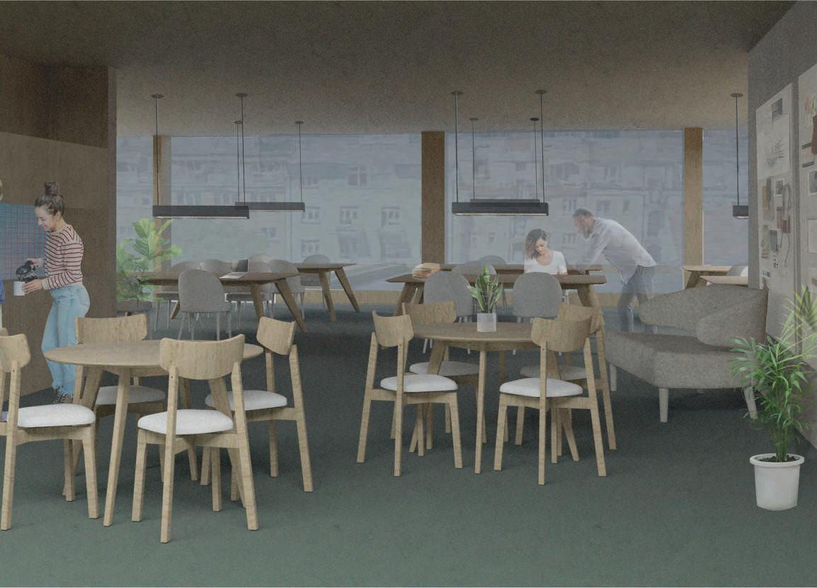 There is a market and shops on the ground floor. The market can also expand out between the houses and into the square. The greenery builds on the existing one and extends further, forming a quieter area with a café and a restaurant.