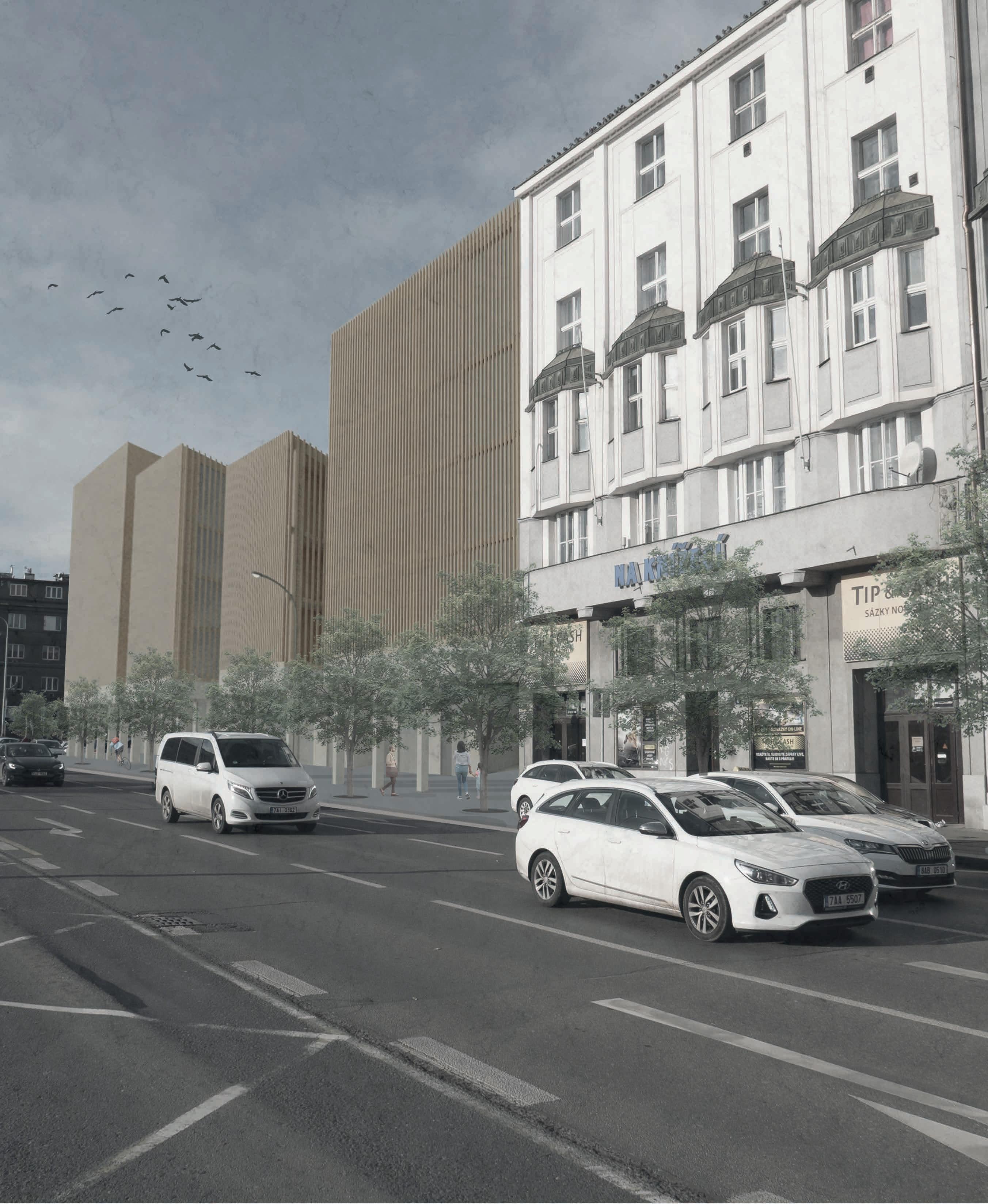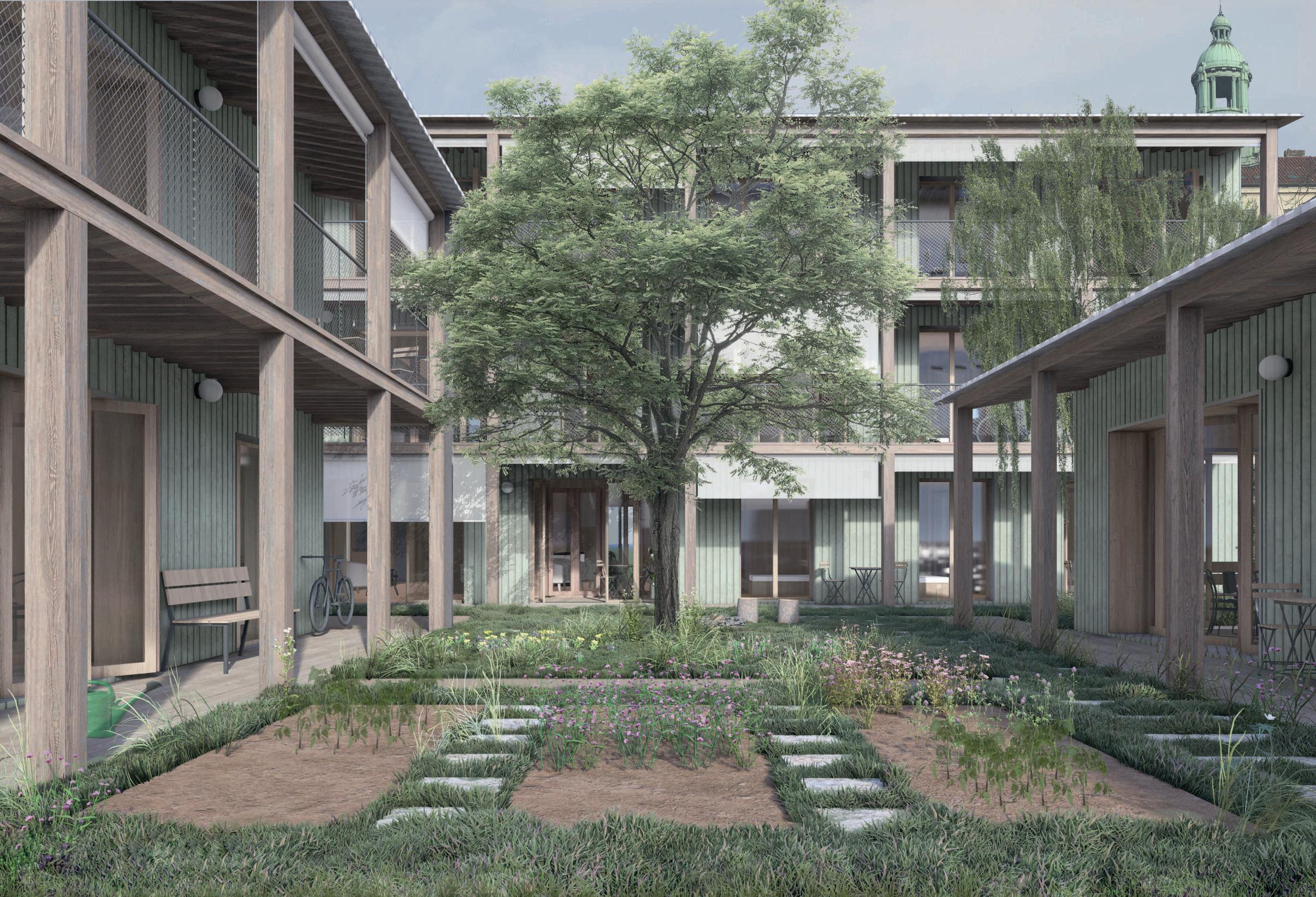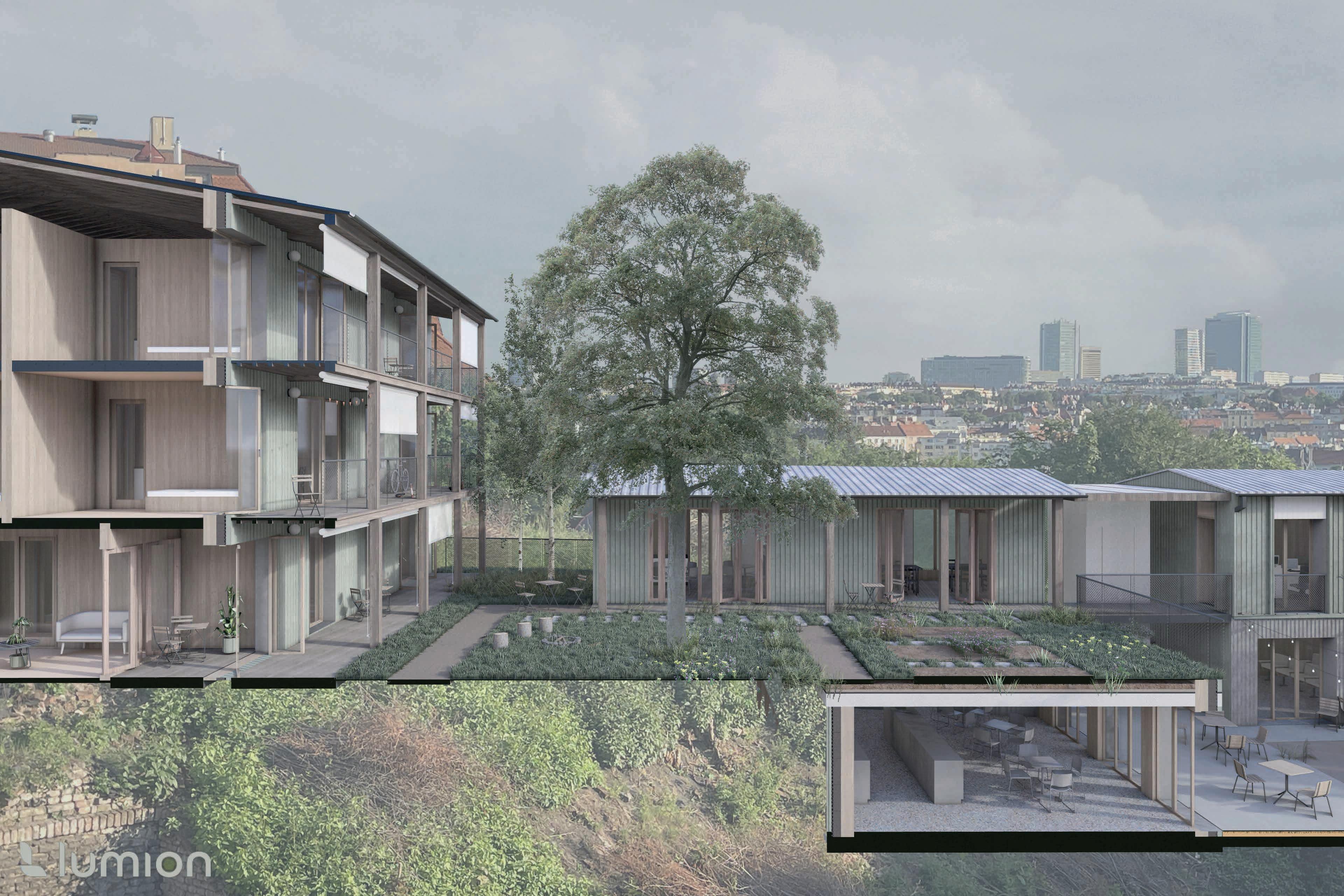Na Stráni Street in Vršovice is a hidden spot within the historic urban fabric, where an overgrown garden offers tranquility and views of Prague. The steep site is accessible via three paths, only one of which is barrier-free. The urban concept responds to the fragmented city blocks, aiming to preserve the character of historic Prague while creating its own world within the block. The design establishes three levels: a residential courtyard, a small square with workshops and a bistro, and a garden with a greenhouse. These levels adapt to the steep terrain, forming an open public space while striving for maximum accessibility. The primary function is protected and community housing, offering diverse apartments, including those adapted for wheelchair users. Walkways connect the apartments to shared spaces facing the inner courtyard. Public areas include workshops, a hall for cultural events, and a bistro. The communal gardens provide space for growing vegetables and keeping small animals. The construction system uses load-bearing wall panels made of compressed straw with a wooden frame. The project fosters community life by integrating housing with public functions.