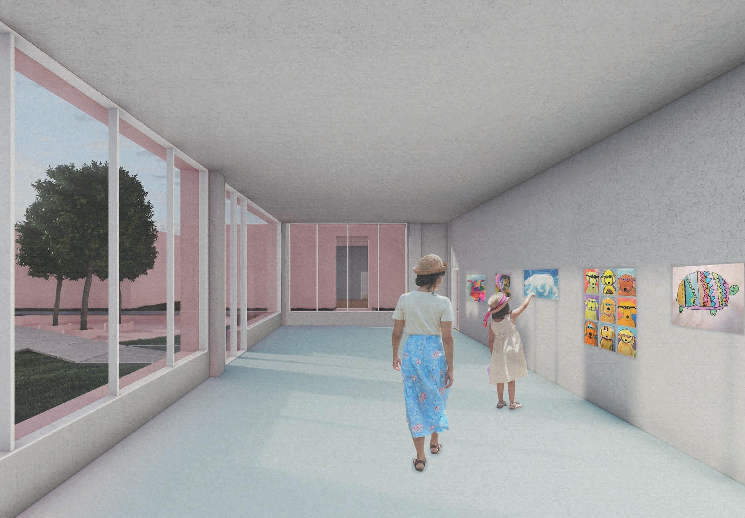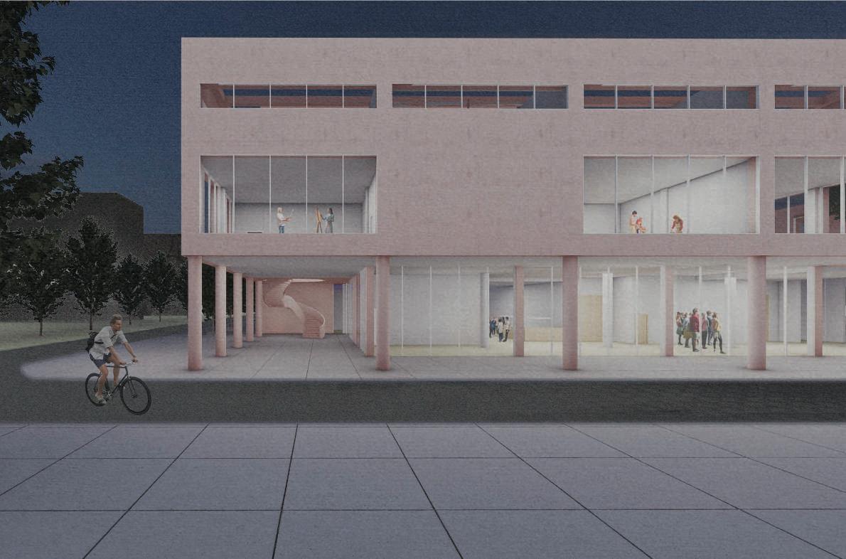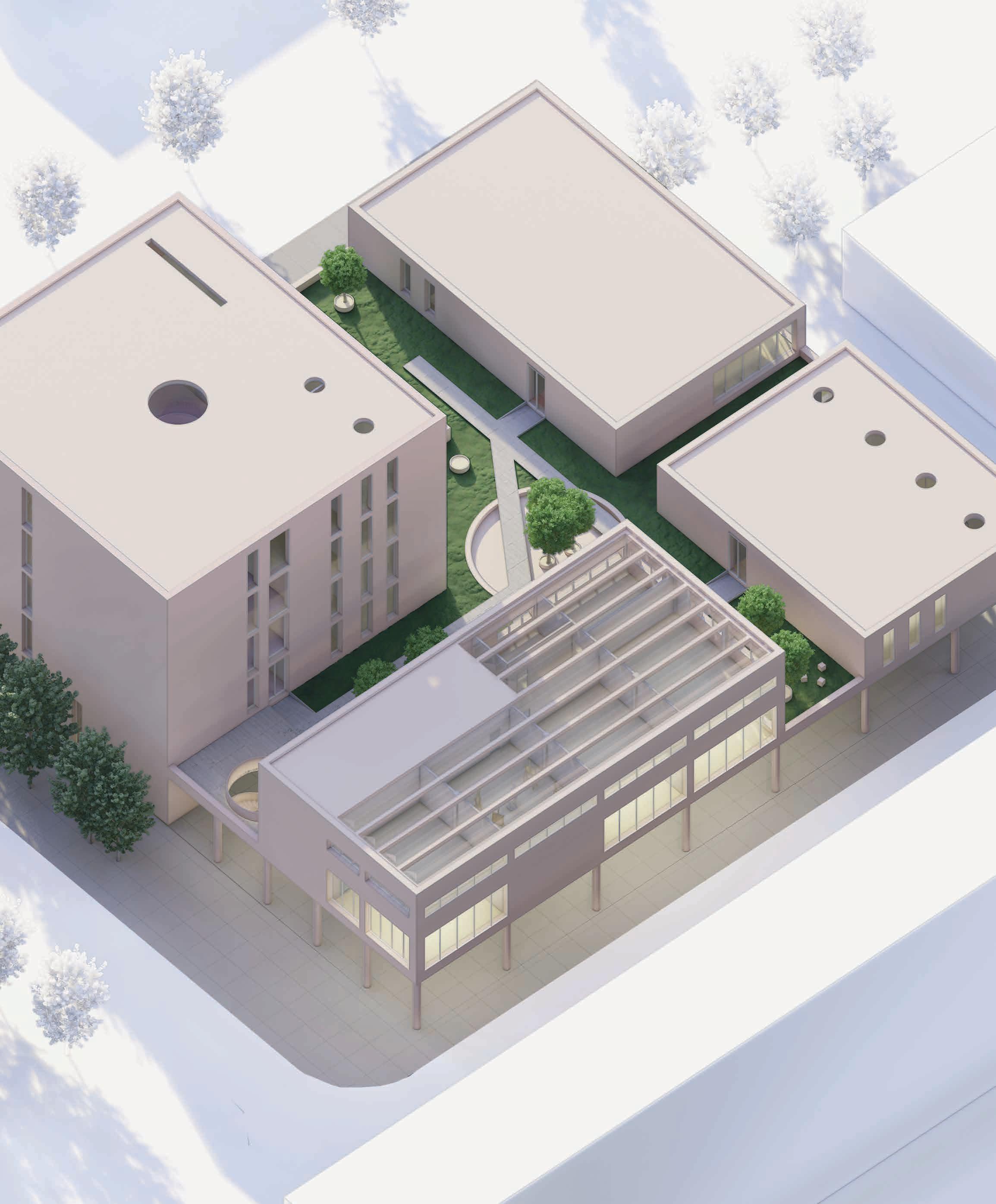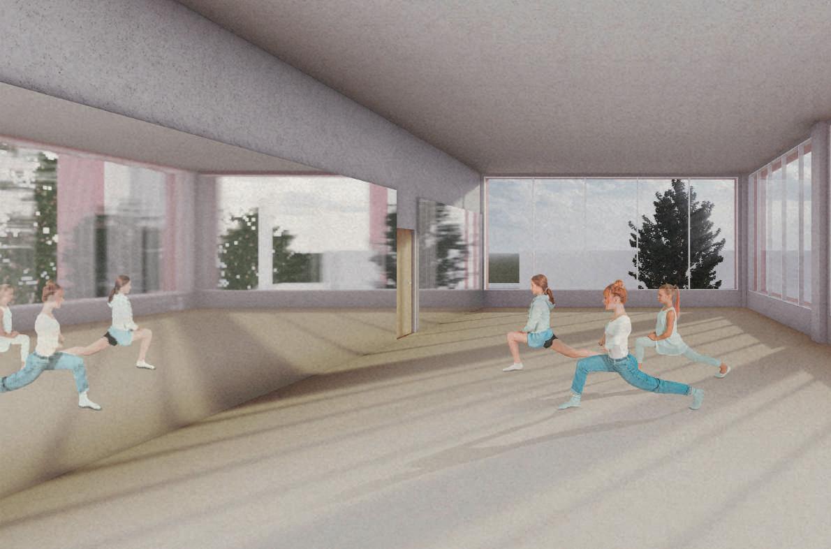 The object to be solved is building the elementary art school in Pardubice based on the upcoming architectural competition. In addition to the Elementary School, the building also serves an important cultural function, offering a multi-purpose hall for concerts and performances. The primary art school has four artistic disciplines - music, art, literature drama, and dance. The branches are each divided into their building, connected by a common garden used for teaching and playing. The building tries to balance between public, semi-public, and private spaces serving the education of children and the enjoyment of the general public.