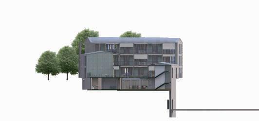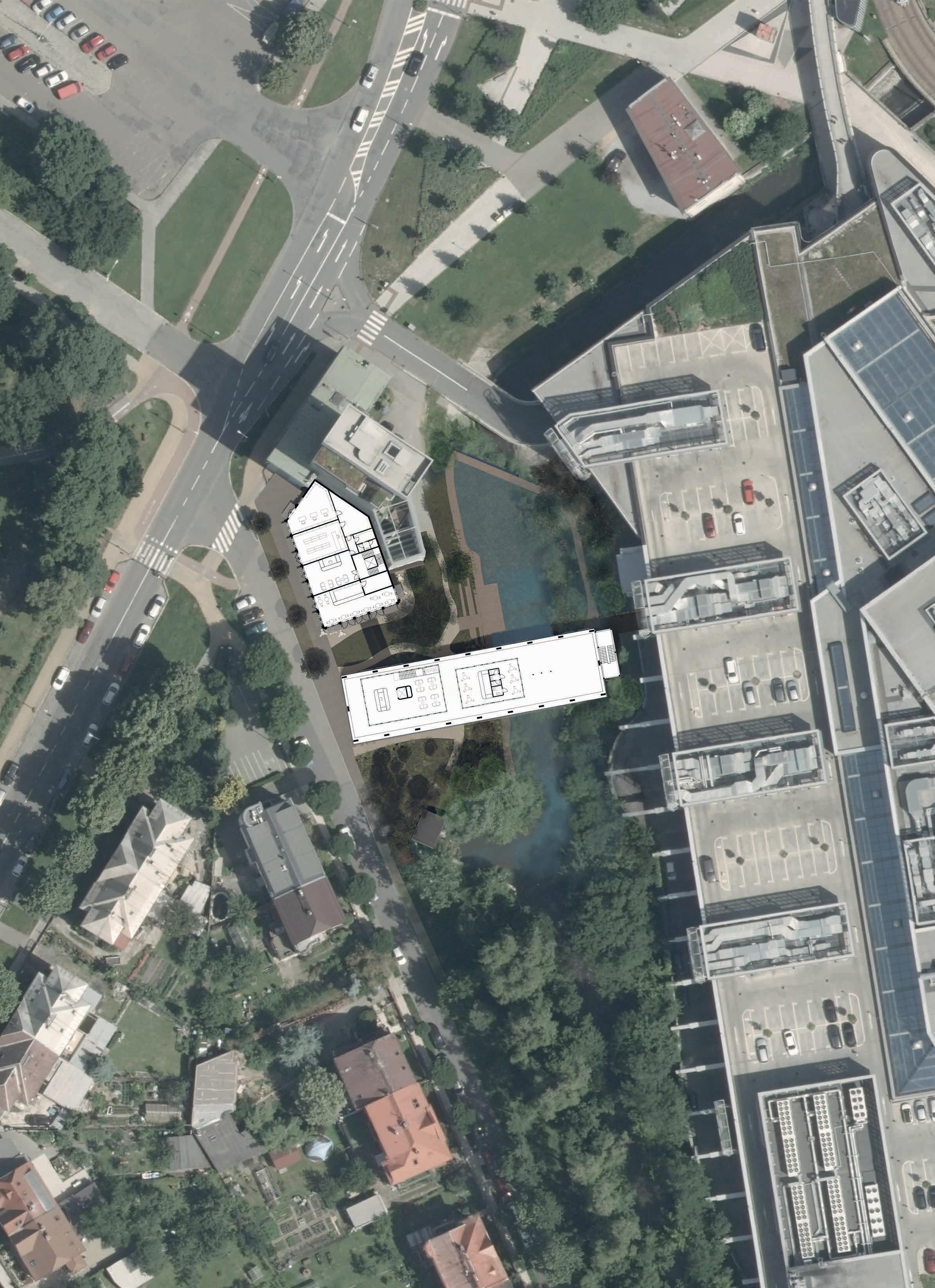 A clinic and fitness center were to be built on the controversial territory in Olomouc. The site is located in Olomouc by a wild arm of the river, near a huge shopping mall, and completes the cluster of high-silver buildings on which the private villa sits. I propose two masses for this environment. One completes the compositionally glued-together buildings. It houses a pharmacy and medical supply stores. Next to it, is a second building of its own, which also functions as a bridge over the river and connects the other bank and the department store, whose roof can be used for parking. A clinic with surgeries is being built on two floors. Each room is ventilated and overlooks the park. The waiting rooms are also open to the park. The building should not feel like a hospital. On the top floor there is a gym and exercise rooms. There is a sauna on the roof. A footbridge connects the houses. There is a playground in the building. In this building, there are small rooms for physiotherapy, rehabilitation, and massage. The house is made of a wooden frame system, its wooden character is also shown outside. The project involved collaboration with an artist who designed metal bars in the shape of a flowing river.