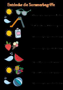 Lösung von oben nach unten: Sonnenbrille, Wasserrutsche, Sonnencreme, Erdbeereis, Wassermelone, Sonnenblume, Wasserball Rätsel Auflösung Seite 37: