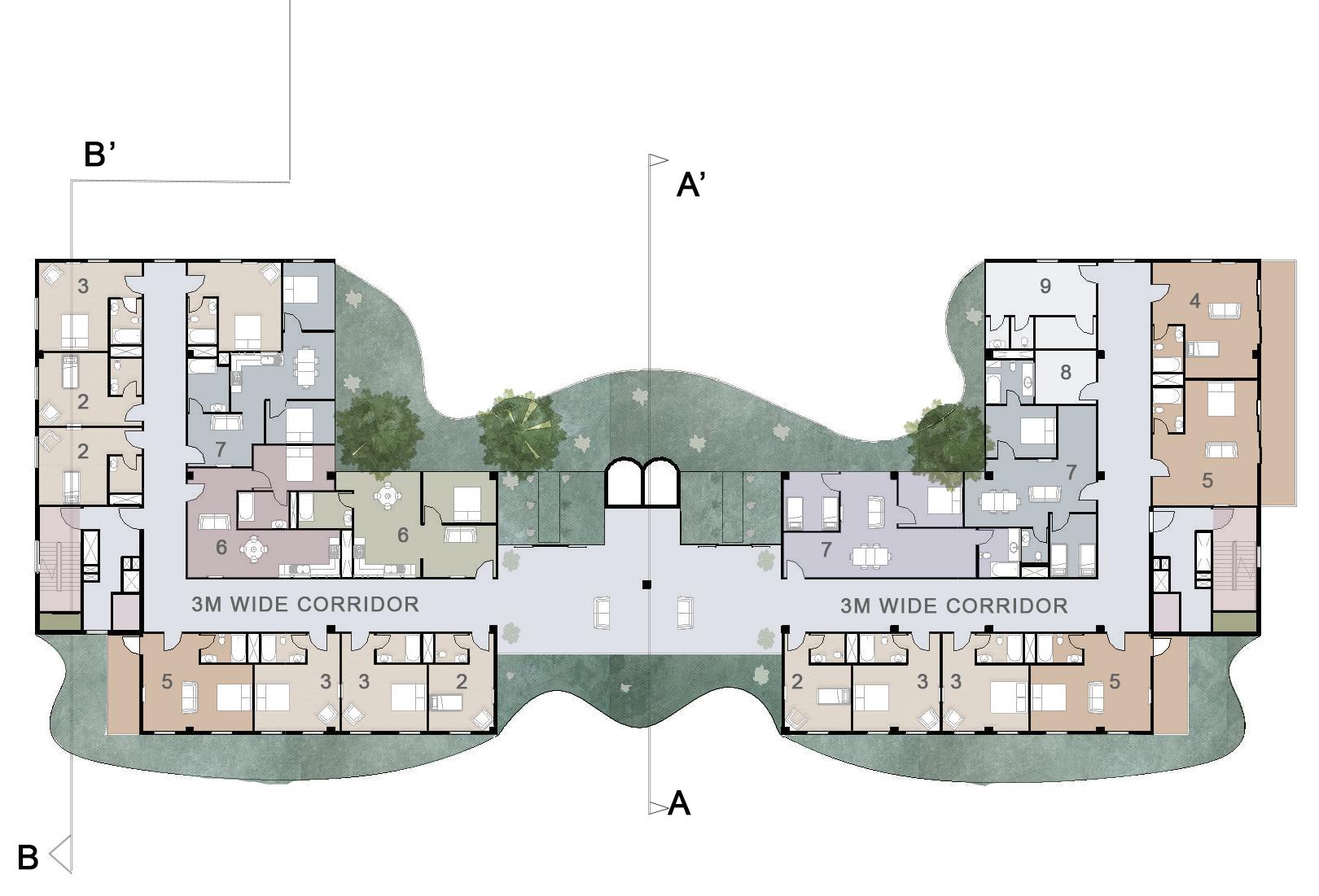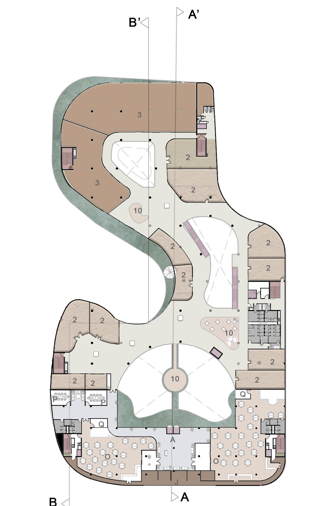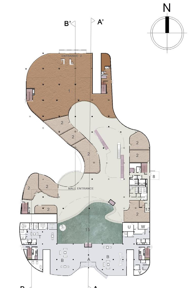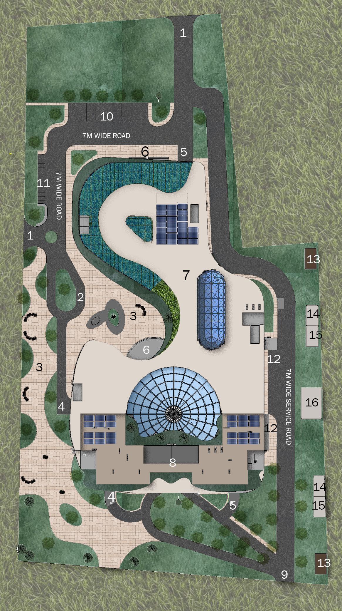 1-ENTRY/EXIT 2-PEDESTRIAN ENTRY 3-DROP OFF 4- 2W PARING 5-BUS