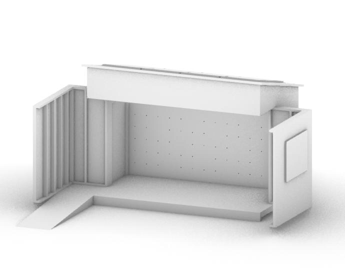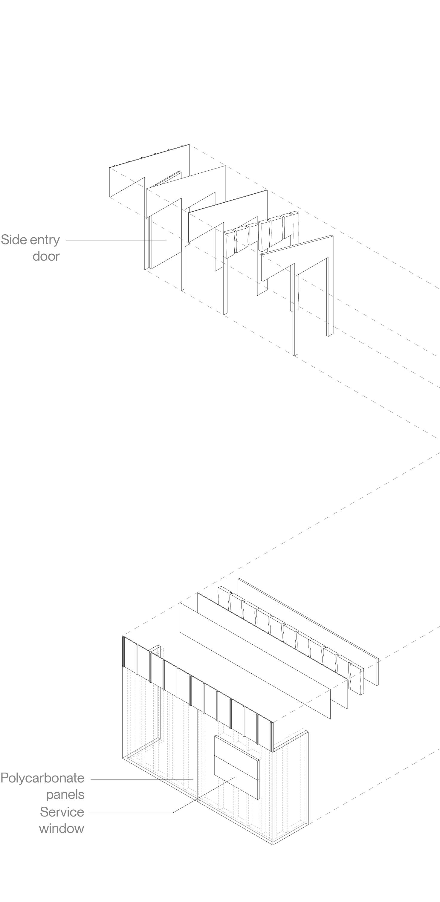 Due to the main act of the structure opening up, the side walls have a hinge around the midpoint, allowing the vendor to choose from three set-up options: fully enclosed, semi enclosed, or fully open. In this way, the design allows the vendor to choose how they wish to represent their business and curate their space.