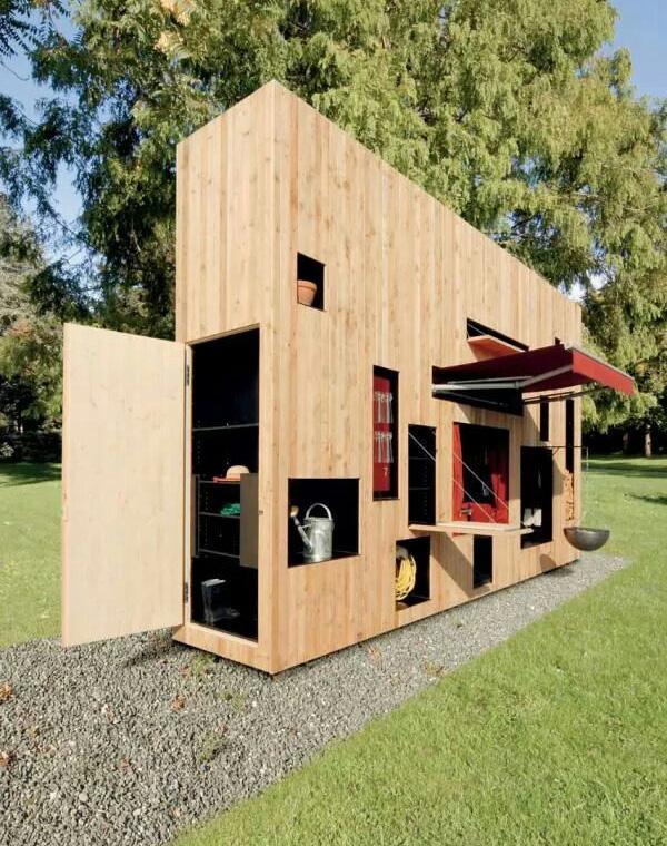 The operable polycarbonate walls are a key feature of this design, highlighting the intent to create a facade that hinges open. At night, the translucent material allows the shed to glow, which can act as a deterrent for break-ins. If a polycarbonate product with an integrated air gap is selected, it also provides thermal insulation for cold weather.