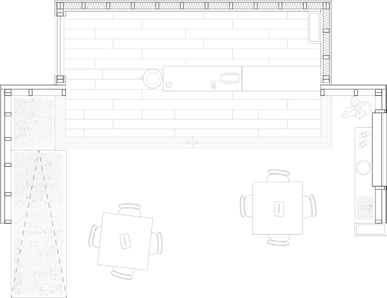 On Hinges focuses on flexibility through walls that hinge outward to claim exterior space as part of the vendor’s operational area. The design emphasizes the indoor/outdoor relationship and encourages pedestrian interaction through soft boundaries. The structure is moved with a forklift and trailer and its dimensions measure 7’ x 15’. The walls hinge at four points to offer the most customization and autonomy by the vendor, allowing the user to create a space that best reflects the needs of their business. Additional elements like a canopy or string lights can span between the open walls to further activate the outdoor space.