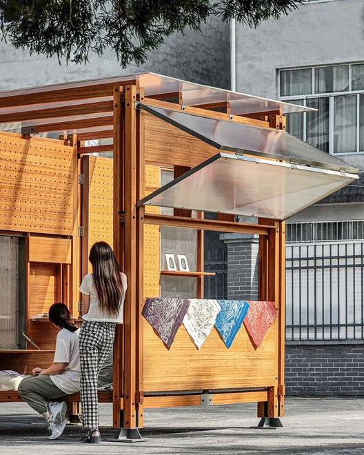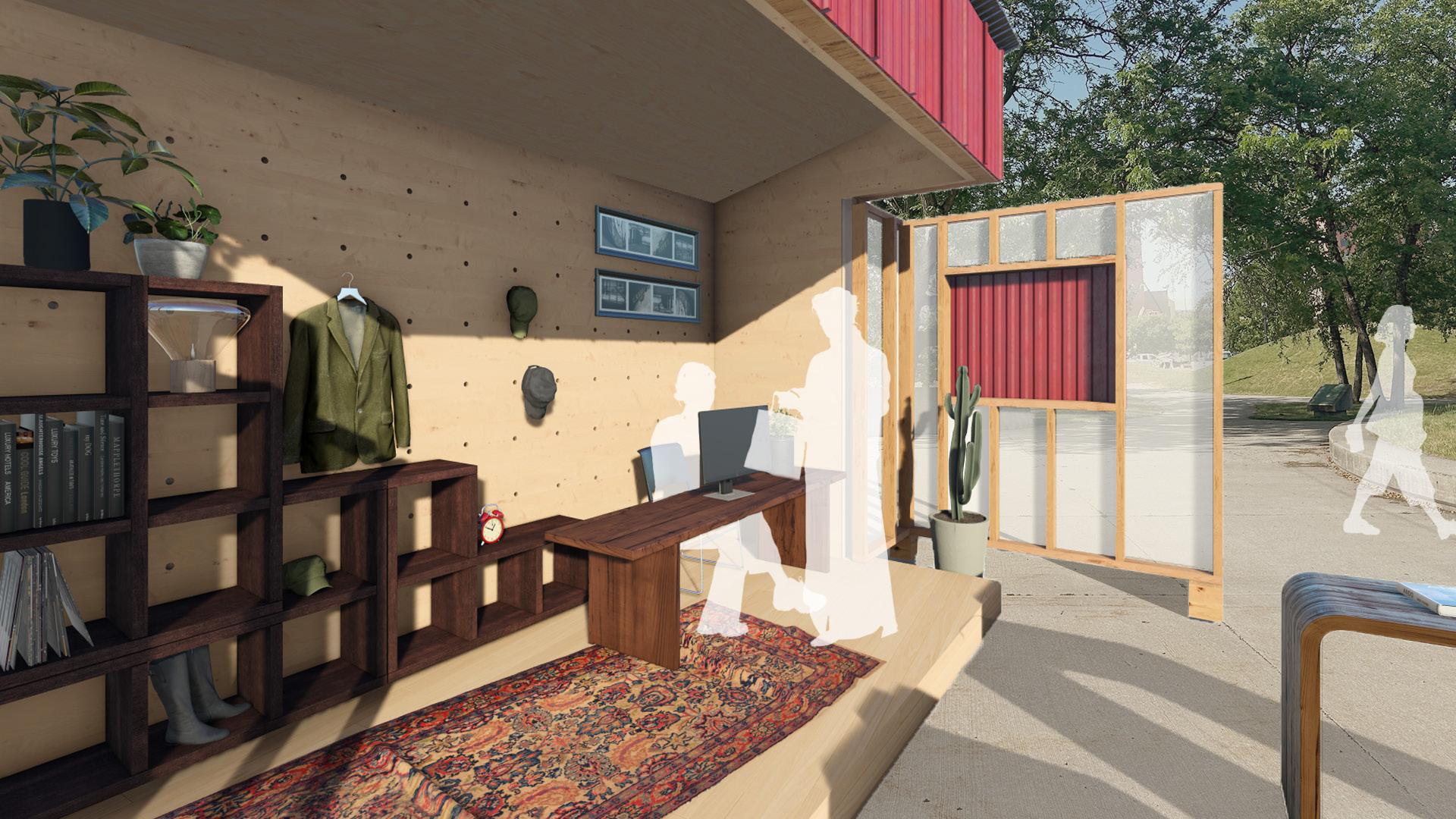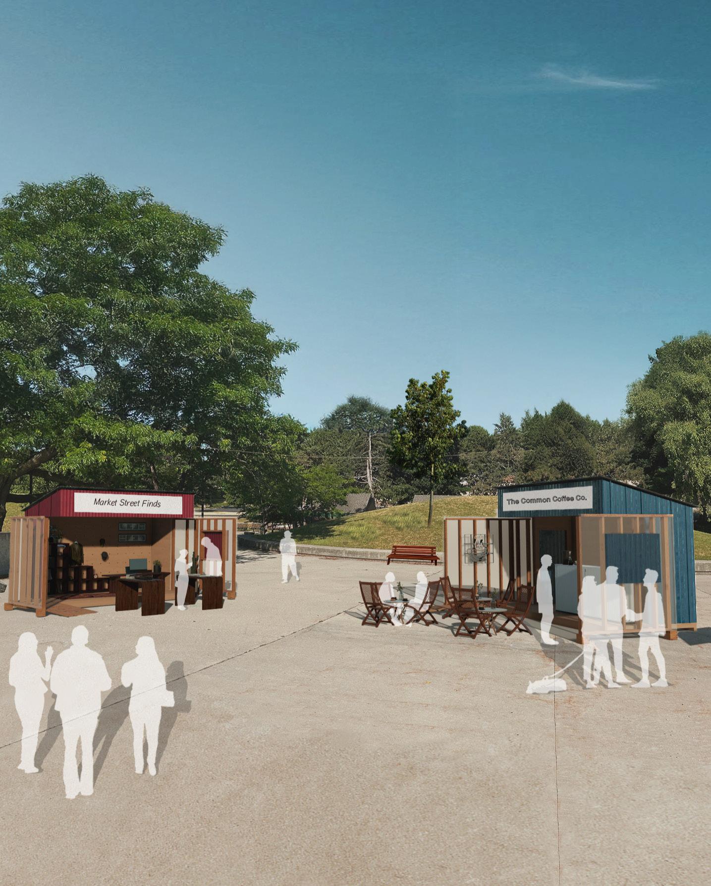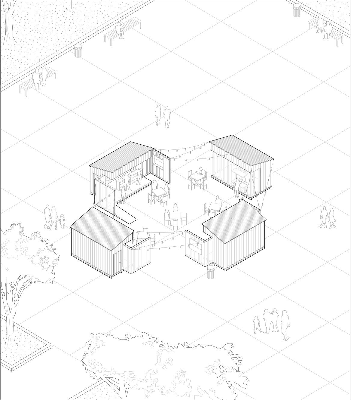 By embracing portability, the structure becomes a catalyst for activation across varied sites, fostering a sense of continuity through movement rather than permanence. This results in a small footprint that creates informal thresholds by capturing exterior space into its programming. With about 100 square feet of usable interior space, the business incubator meets building code requirements, and doesn’t require fire department involvement. The sheds are crafted with durable materials and a locking sequence to ensure the structure stays secure when the business is not in operation.