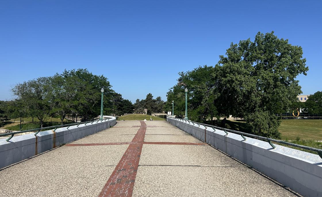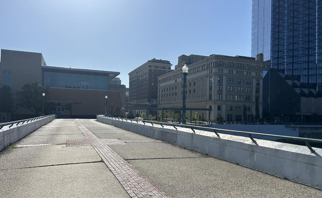 Ah-Nab-Awen Park is one of the riverfront sites examined during the site walk. It was selected as a key example of the riverfront typology due to its expansive area along the riverfront, offering both green space and paved areas. The park is also connected to the Gillette Bridge, presenting additional opportunities to activate this area of the city. With the Gerald R. Ford Presidential Museum as a backdrop, the site offers potential to accommodate a variety vendors during events. The site is shown being approached from Gillette Bridge, connecting Downtown Grand Rapids with the park.