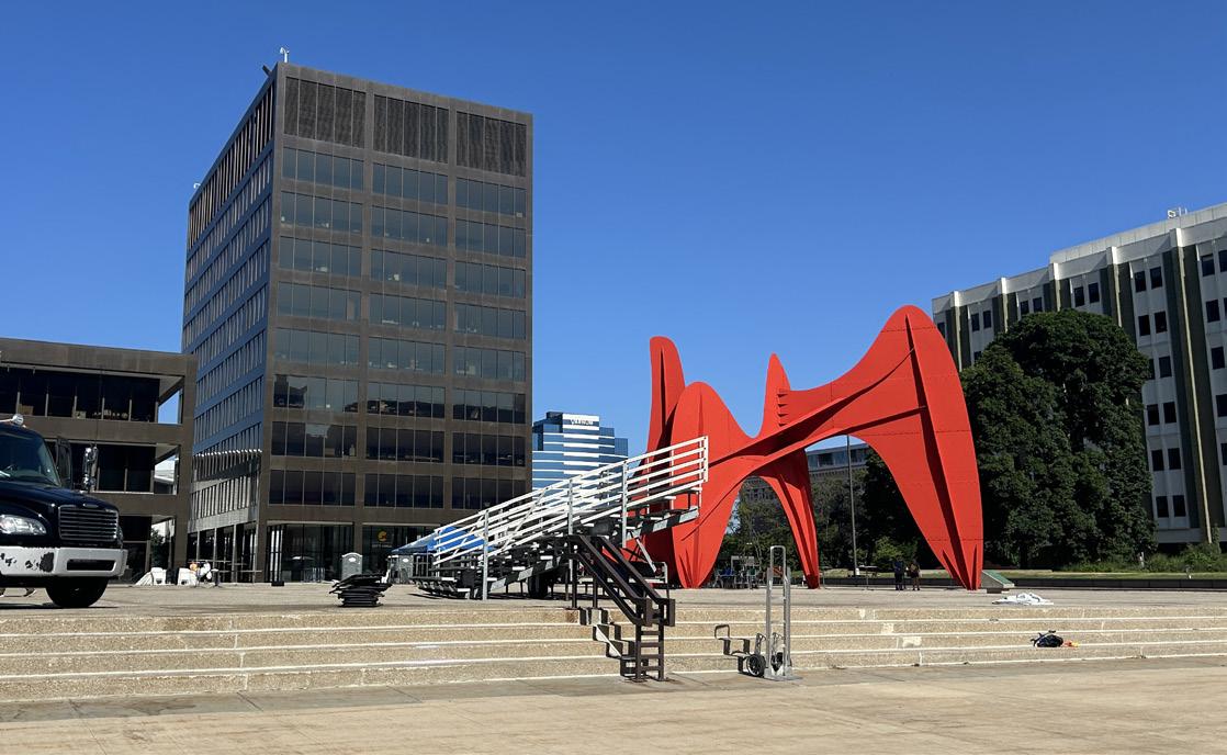 Calder Plaza is the one of the urban sites that was explored during the site walk. It was selected as a key example of the urban typology due to its central location in the city, expansive paved area, and existing use as an event space. The site includes a ramp that provides truck access to the elevated platform, making the placement and removal of pop-up structures relatively straightforward. Accessible from Ottawa Ave NW, the site is approached with the structures on the foreground of the plaza and the La Grand Vitesse and City Hall framing the background.