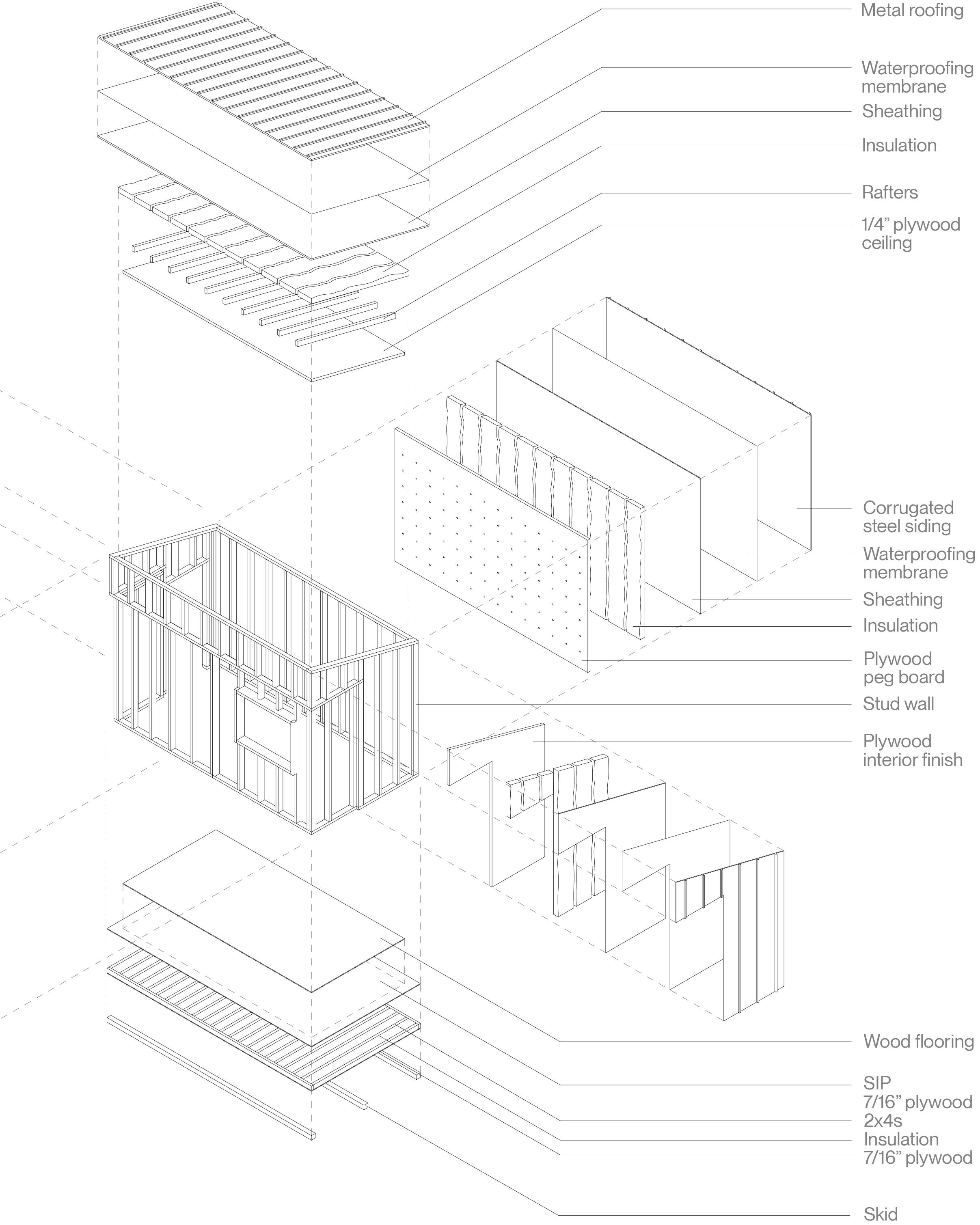 Affordability of the sheds was also considered when choosing materials. The less the sheds cost to build, the more the city can produce, and as a result, more businesses can afford to rent out the structures. With high quantities of the business incubators, groups of them can be placed on sites in clusters to activate the space and bring people together.