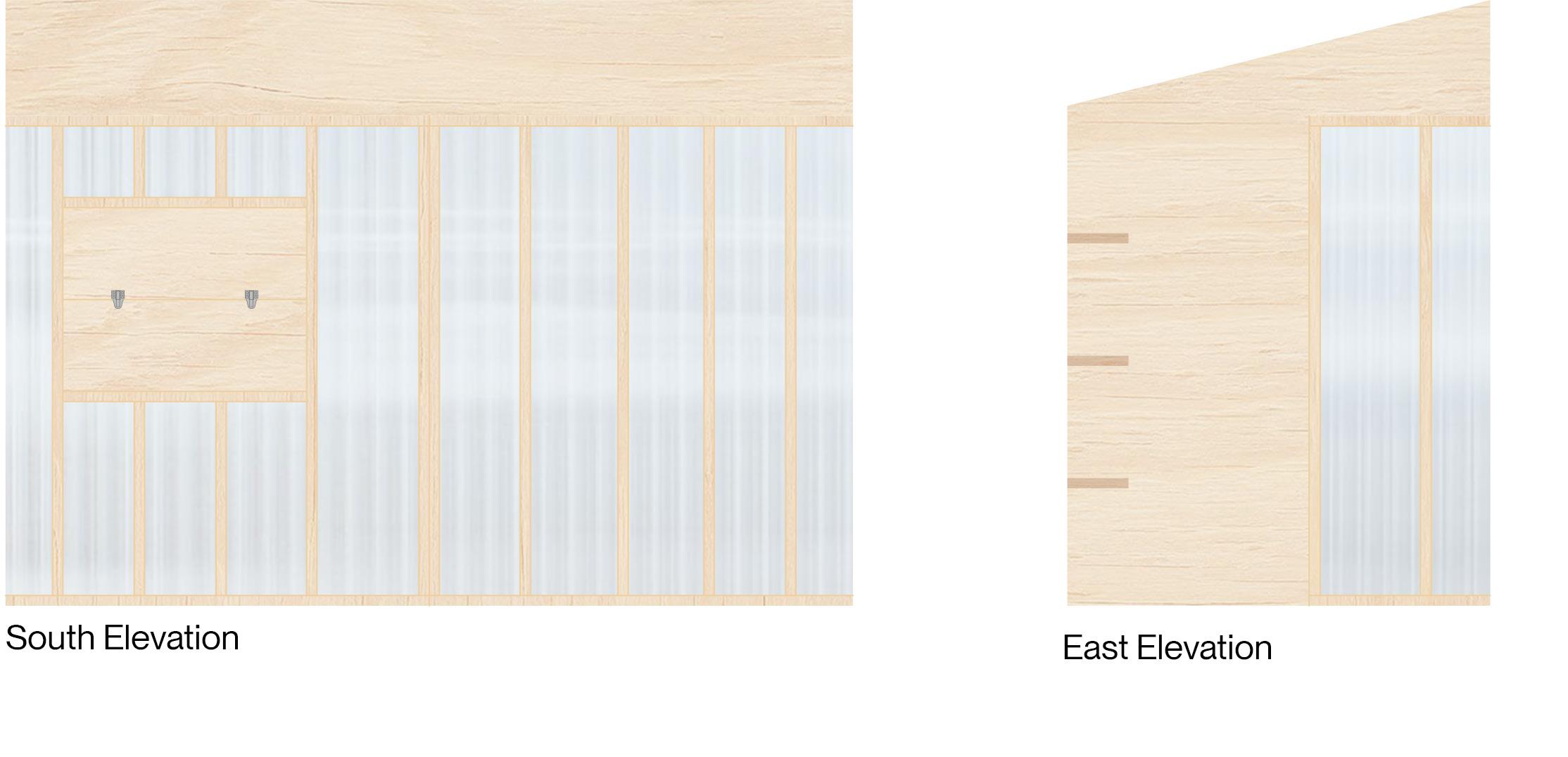 The elevations reveal the exterior presence of the sheds with bold primary colors, reflecting the branding and presence of the City of Grand Rapids. The polycarbonate panels highlight the hinging walls of the structure, as well as unify the different color options for the exterior metal siding. The plywood interior provides a blank canvas for individual vendor branding, which is revealed when the walls are open.