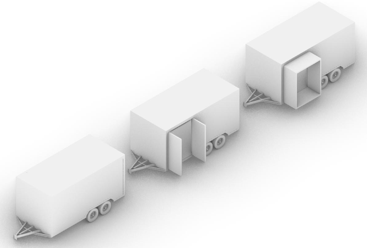 After researching precedents that aligned with the goals of scale, mobility, and adaptability, three design concepts were developed: On Tracks, On Wheels, and On Hinges. Each concept explores a different method of adapting and moving the structure to meet various vendor needs.
