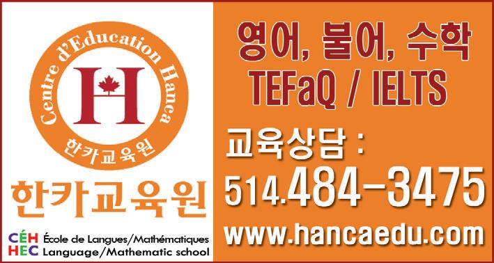 Friday Sep 23, 2022 광 고 Let’s continue to protect ourselves! Cough into your sleeve Wash your hands Keep your distance 1 m Cover your face Québec.ca /coronavirus 1-877-644-4545 21-210-114WA 끝까지 책임지는 단계별 세금신고 및 회계 서비스 The Service where you get solutions! ▶ 세금신고를 위한 사전인터뷰 진행 ▶ 충분한 설명과 주의점 안내 후 신고완료 ▶ 세금신고 후 약속한 후속서비스 제공 및 관리 텍스클리닉 / Vie Facile Canada 문의 514.446.9721 viefacilecanada@gmail.com (사전 문의) 7571 rue d’iberville, Montreal, QC H2E 2Z1 3333 Cavendish Blvd Suite 300, Montreal, QC H4B 2M5 평상시 세금관련 궁금한 점들을 이메일로 보내 주시면 한카에서 무료로 열리는 정기세미나에 반영하도록 하겠습니다. Gwang Yang MBA specialization in Accounting Remote Tax Expert / Intuit Previous Senior Tax Professional / H&R Block 개인 세금신고 ▶ 과거 세금신고 수정 ▶ 복잡한 세금신고의 정확한 처리 ▶ 고객 맞춤형 절세계획 및 재정설계 ▶ 잃은 혜택을 찾기 위한 점검서비스 사업자 회계 및 세금신고 ▶ 사업자안내 및 등록 ▶ 정확한 회계서비스 제공 및 책임관리 - 소비세, 페이롤 및 세금신고 ▶ 개인세금신고에 연계한 절세계획 및 재정설계