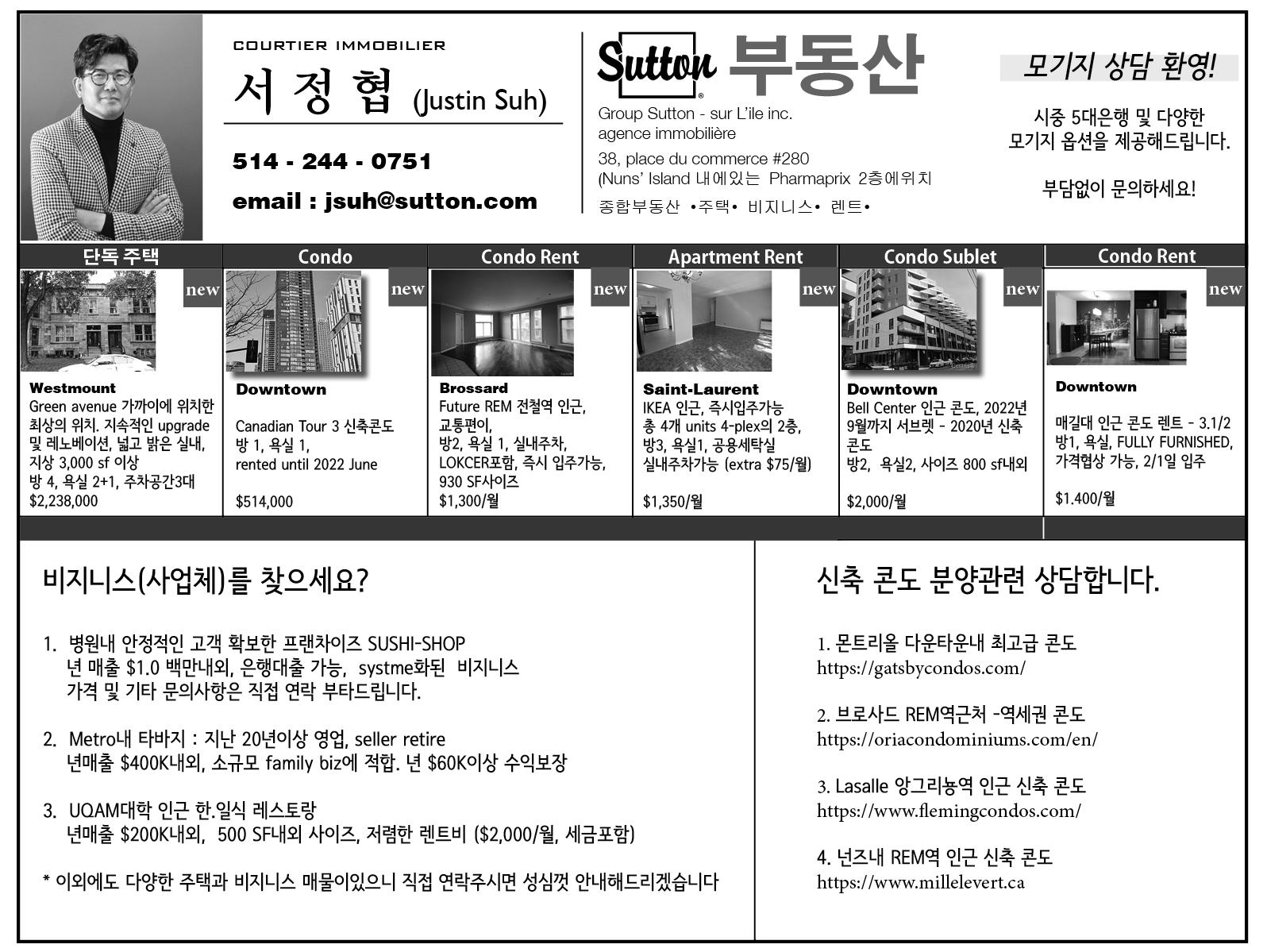 ➑ Friday Feb 03, 2023 한국 소식 모든 거래는 세 명의 중개인이 공동 상의하여 진행하며 전문적이고 안전한 중개 서비스를 드릴 것을 약속드립니다. Eric Oh 오용균 세 명의 부동산 중개인 이 당신과 함께 합니다. 514.791.8377 언어 서비스