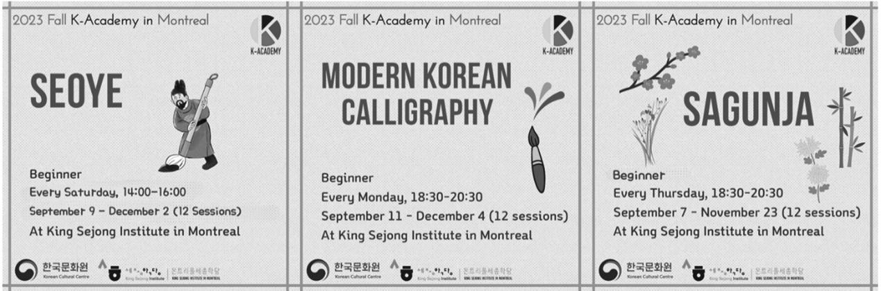 당(K-Academy together)을 개최한 바 있다. 오는 9월부터 시작되는 2023 몬트리올 가 을 K-아카데미는 각 분야의 전문 강사를 초 빙하여 서예, 모던 한글 캘리그라피, 사군자 총 3개 한국 문화 강좌로 운영될 예정이다. 모든 강좌는 현지인 대상으로 12주간 운영 되며, 무료로 수강이 가능하다. 2023 몬트리 올 가을 K-아카데미에 대한 자세한 정보는 몬트리올세종학당 문화팀 홈페이지(https:// www.learnkoreanculture.ca)에서 확인할 수 있다.