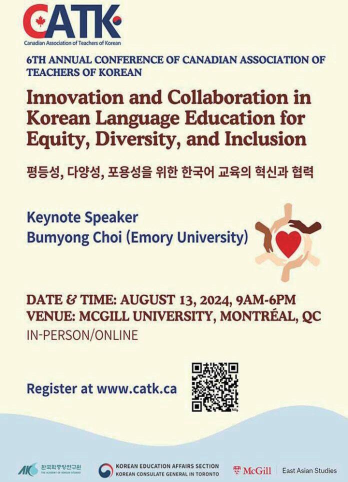 캐나다한국어교육학회 (CATK)가 오늘 8 월 13일 (화) McGill University에서 여섯 번째 연례 학술대회를 개최합니다. McGill University에서 열리는 이번CATK도 작년과