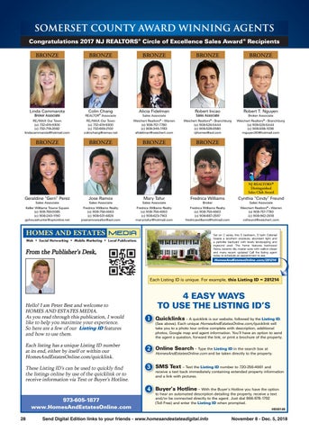 SOMERSET COUNTY AWARD WINNING AGENTS Congratulations 2017 NJ REALTORS® Circle of Excellence Sales Award ® Recipients BRONZE
