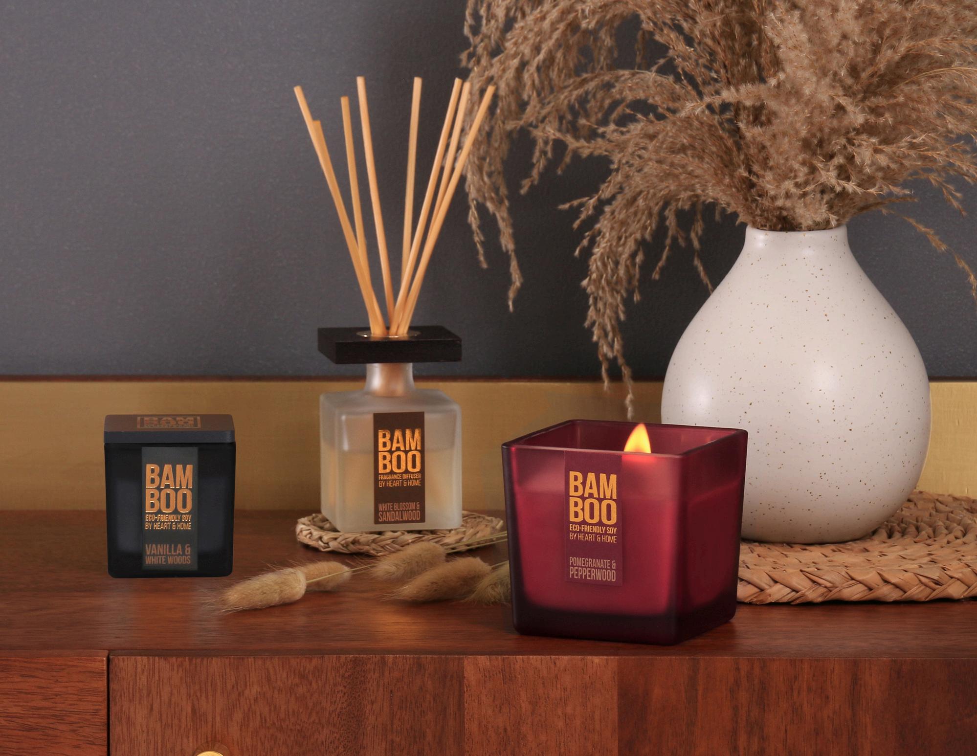 Bamboo Home Fragrance: a luxurious, eco-conscious collection. Crafted with natural, sustainable ingredients, our soy wax candles feature crackling wooden wicks. Explore room sprays, diffusers, and wax melts infused with pure essential oils