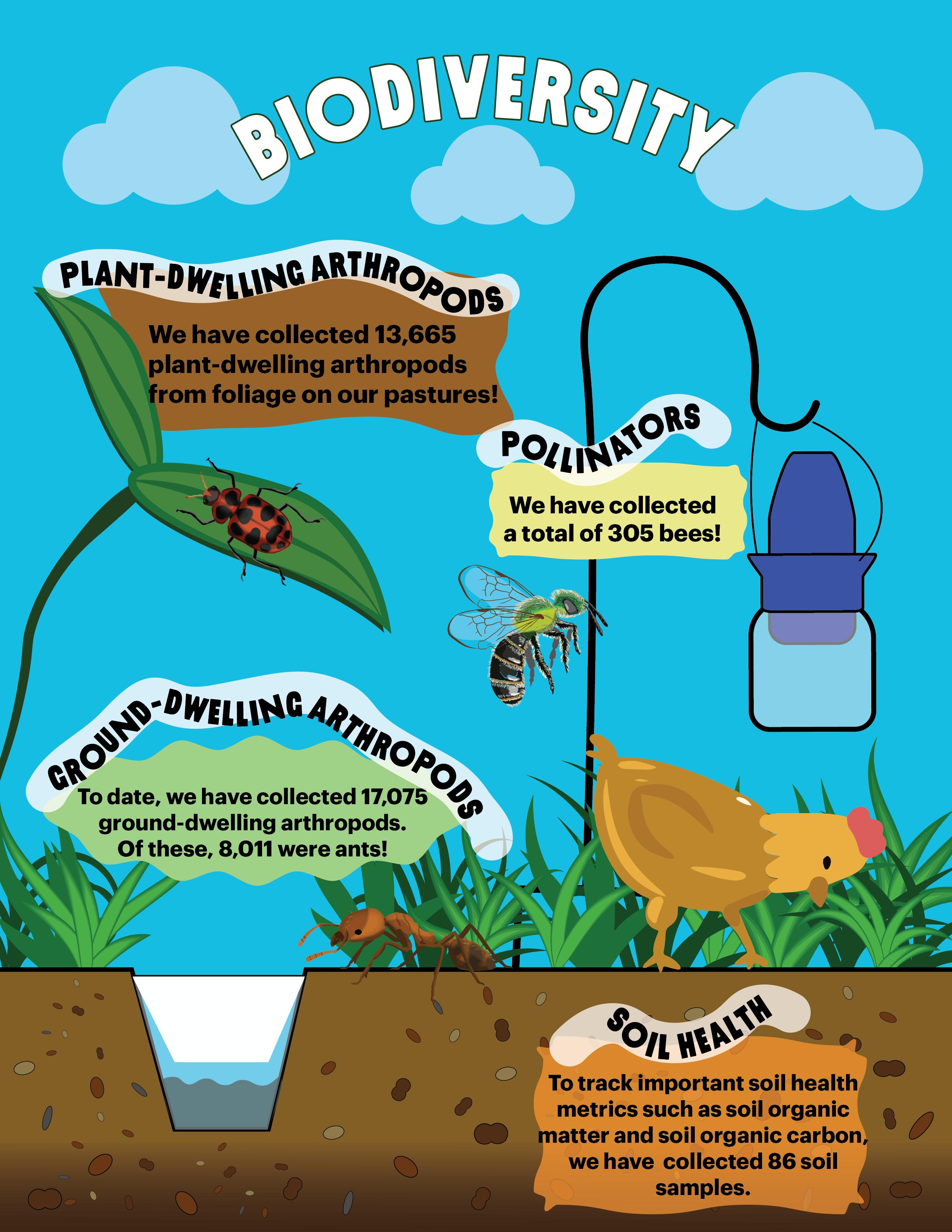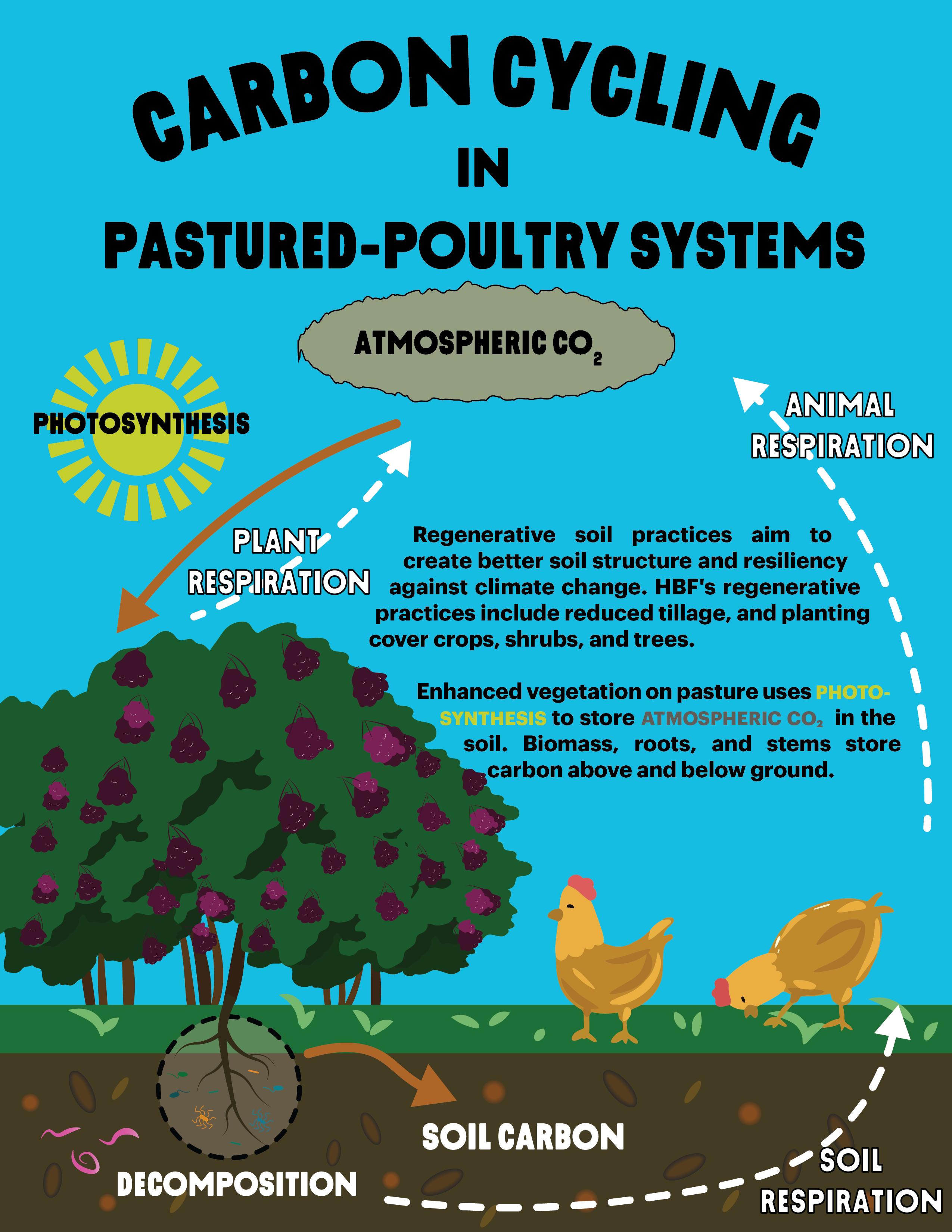 We are proud to enter into the second year of our USDA Regenerative Egg Farming Project grant, which launched in 2022. Through this grant, our focus has been to understand the benefits of tree planting, cover cropping, water management, and livestock integration on layer hen farms. Our ongoing progress involves mapping out this relationship through soil and emissions data, highlighting the intricate connections between carbon cycling and the role of chickens within our agricultural framework.