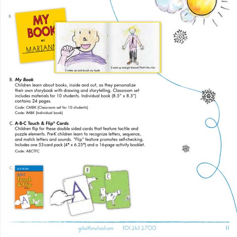 C. A-B-C Touch & Flip® Cards Children flip for these double sided cards that feature tactile and puzzle elements. Pre-K children learn to recognize letters, sequence, and match letters and sounds. “Flip” feature promotes self-checking. Includes one 53-card pack (4" x 6.25") and a 16-page activity booklet. Code: ABCTFC