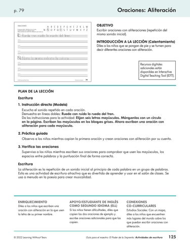 PLAN DE LA LECCIÓN Escritura 1. Instrucción directa (Modela) Escucha el sonido repetido en cada oración. Demuestra en líneas dobles: Rueda con ruido la rueda del tren. Da las instrucciones para la actividad: Elijan seis letras mayúsculas. Márquenlas con un círculo en la página. Escriban las mayúsculas en los bloques grises. Ahora escriban una oración con aliteración para cada mayúscula.