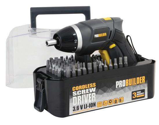 Akukruvikeeraja 3,6V 1,3Ah Li-Ion aku, laadimisaeg 3-5h, 180p/min, 10+1 momenti maks. 4Nm, Led valgusti, aku täituvuse indikaator. Kaasas 54 kruvikeeraja otsikut.