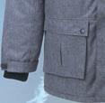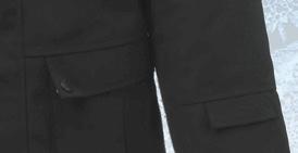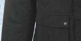 Palju taskuid, pikendatud seljaosa, kõrge krae, peegeldavad elemendid. Värvus sinine või must.