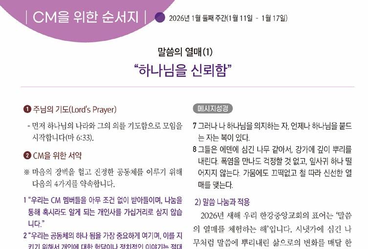 령의 아홉 가지 열매로 이름 붙여진 CM은 ‘전인적인 소그룹이 살아 있는 건강한 교회’를 세워가는 중요한 뼈대입니다. 초대교회가 성전의 예배와 가정의 나눔이 조화를 이루며 성장했듯이, CM은 예