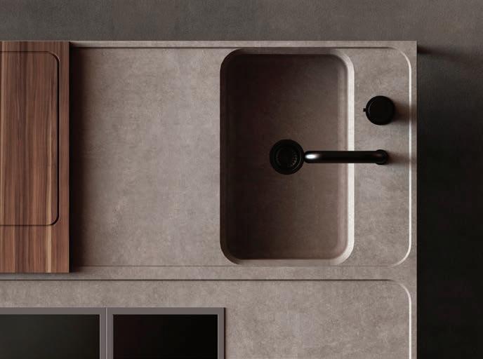 THE CONCRETE COUNTERTOP, MADE IN A SINGLE CASTING, IS COMPLETELY HOLLOWED OUT INSIDE FOR A THICKNESS VARYING FROM 20 TO 30 MM.