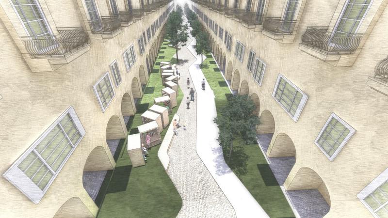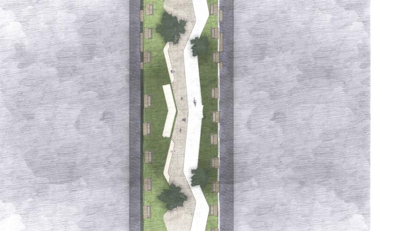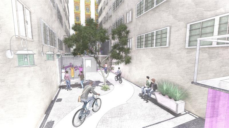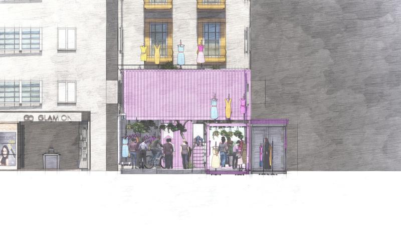 Removing the bulky buildings and replacing it with smaller , adaptable containers to create space for a bike lane,public seating, and pedestian pathway