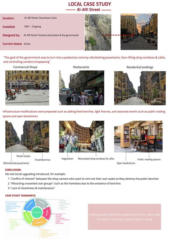 shops workers 30-39 30% 20-29 20% 10-19 15% 40-49 15% 5-10 10% 50+ 10% shopworkers 40% buildingskeepers 20% streetvendors 10% workshops 20% bankworkers 10% families delivery men buildings keepers AGEGROUPS: J0BS: street vendors children BEHAVIOURALCHOREOGRAPHY: USERPROFILES: People of the street: working women HISTORY 8:00 AM 10:00 AM 12:00 PM 3:00 PM 7:00 PM 12:00 AM 1880 1952 1919 1940s 1970s 1980s 2000s 2011 Consumerism surges transforming local stores & apartments to retail hubs Capitalize on cheap retail outlets A wave of elite abandonment & replacement with middle cass An identity lost and found through political activists Paris-inspired architecture to modernize Cairo Transforming into art-centric, intellectual center of Cairo Transforms into a state district upon the Free Officers revolution Egyptian Independence upon the 1919 revolution