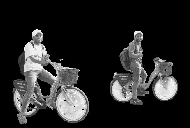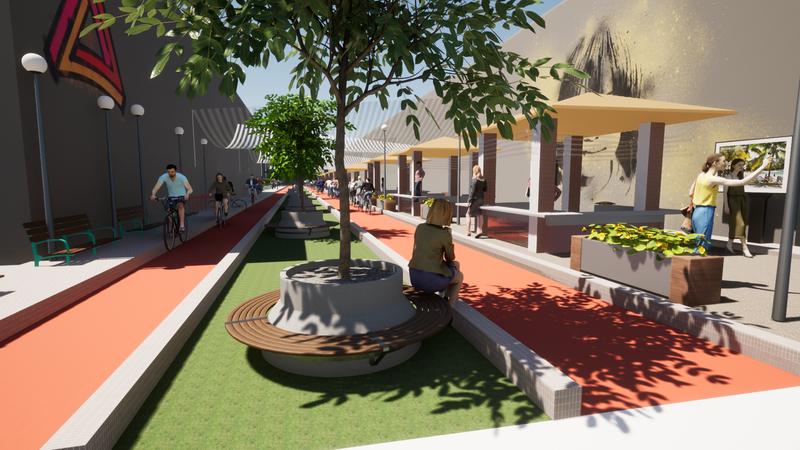 Bike lanes with dynamic detours to be able to explore the shops/exhibitionspace slowly + shading vegetation to reduce heat & stress