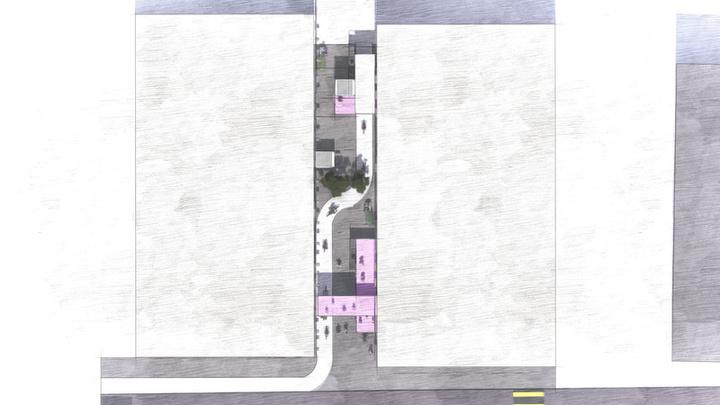 rooftops the rooftops as open exhibition for the shops to create visibility + changing the nature of the alley to a safer, family oriented one.