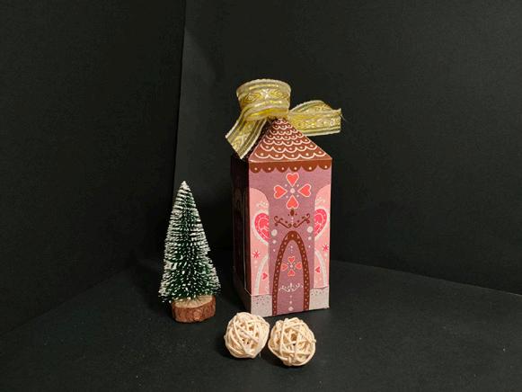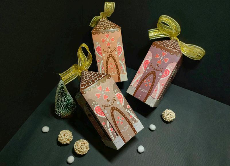 外型:以薑餅屋為包裝主視覺,並在轉 折處挖洞去露出裡面內盒的包裝。