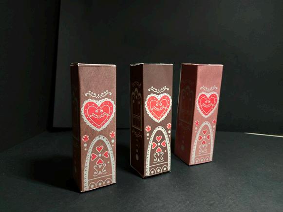 包裝內容為草莓果醬,因此用草莓的形 狀做為主體,因為用厚紙板,所以在紙 板上加貼紙做為裝飾點綴。