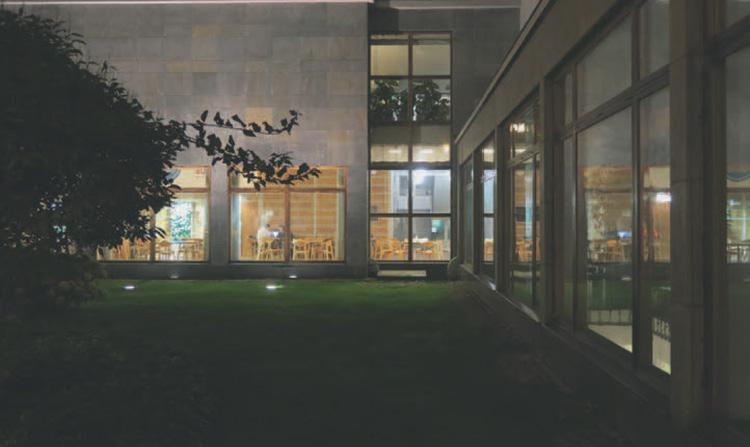 What used to be a backyard filled with waste bins was converted into a peaceful outdoor rest area. The ground was paved, partly with ceramic slabs and partly with natural stone slabs and equipped with benches made of soapstone and three lighted steel spirals covered with clematis. The novelties in the basement – the library’s and Futurum’s ceiling lamps – stick out with their slanting glass sheets.